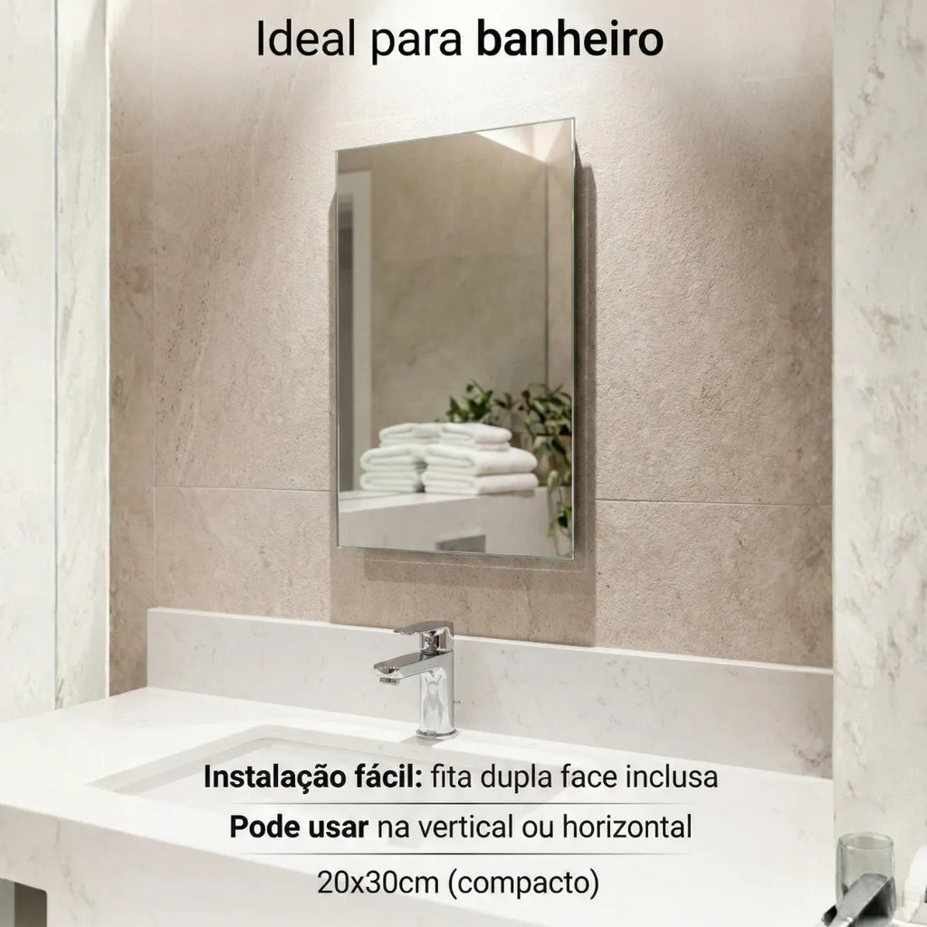 Espelho de Banheiro e Lavabo 20x30cm Premium Lapidado Transforme seu banheiro ou lavabo com o Espelho Retangular 20x30cm, um item que é tendência em organização e estética funcional. Com um design clean e acabamento lapidado que elimina bordas cortantes, este produto é perfeito para banheiros pequenos, lavabos ou até dentro do box, criando uma atmosfera de limpeza e modernidade. O toque final que seu projeto precisa para se destacar com praticidade. Este Espelho oferece a solução definitiva para quem evita furos em azulejos, permitindo que você instale de forma simples na vertical ou horizontal. O sistema de fixação por fita dupla face de alta aderência proporciona facilidade e controle total, sendo ideal para rituais diários como maquiagem, skin care ou para fazer a barba com precisão. Além disso, pode ser em superfícies lisas e secas, adaptando-se ao seu espaço e estilo. A fabricação em vidro cristal de alta qualidade garante durabilidade e resistência contra a umidade comum desses ambientes, enquanto o polimento lateral funciona com precisão para um toque suave e seguro. O acabamento premium não só melhora a experiência do usuário, como também valoriza o ambiente, seja ele um banheiro social moderno ou um lavabo compacto e clássico. ESPECIFICAÇÕES TÉCNICAS Altura: 30 cm Largura: 20 cm Profundidade: 3 mm Material: Vidro Cristal de Alta Qualidade Acabamento: Lapidado de Segurança Fixação: Fita Dupla Face Premium Peso: Padrão Categoria (Aprox. 450g) Fonte do produto: Nacional FUNÇÕES E CARACTERÍSTICAS Resistente à umidade de banheiros Instalação limpa e rápida (sem ferramentas) Reflexo nítido e real (vidro de verdade) Design moderno e sofisticado COMPATIBILIDADE Ambientes recomendados: Quarto, Closet, Hall de entrada, Lavabo, Banheiro, Sala de estar, Corredor, Provador de loja, Salão de beleza, Clínica de estética, Studio de maquiagem e Ambientes Corporativos. Adapta-se a diferentes estilos como: Minimalista, Contemporâneo e Industrial. ORIGEM DO PRODUTO Fabricado no Brasil GARANTIA 3 meses contra defeitos de fabricação. A garantia cobre defeitos de fabricação e não inclui danos causados por uso inadequado. Para acionar a garantia, entre em com nosso suporte ao cliente. INSTRUÇÕES DE USO Limpe bem a superfície (azulejo, vidro ou parede lisa) com álcool e seque totalmente. Retire o liner protetor da fita dupla face no verso do espelho. Posicione e pressione firmemente o espelho contra a superfície por 40 segundos. Caso não tenha experiência com instalação de acessórios, recomendamos a contratação de um profissional ou consulta ao manual. Adquira já o seu Espelho para Banheiro e Lavabo e transforme seu ambiente hoje mesmo! Aproveite para dar um toque de sofisticação e qualidade com este produto exclusivo. espelho banheiro, espelho lavabo, espelho de barba, espelho pequeno, espelho sem furo, espelho com fita, decoração banheiro, espelho 20x30, espelho lapidado, espelho retangular, espelho adesivo, espelho para box, espelho maquiagem, vidro decorativo, casa e decor, utilidades domesticas, lavabo moderno, espelho funcional, espelho prático, acabamento lapidado.