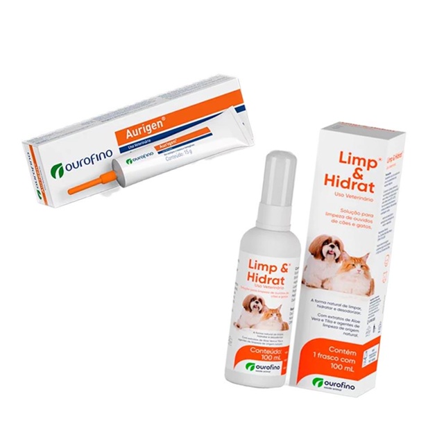 Kit 1 Aurigen Ourofino 15g + 1 Limp E Hidrat 100ml Otite Aurigen é um agente antibacteriano, antifúngico e anti-inflamatório de uso otológico indicado no tratamento de otites agudas e/ou crônicas causadas pelos seguintes fungos e bactérias que acometem cães: Staphylococcus aureus, Arcanobacterium pyogenes, Proteus mirabilis, Proteus vulgaris, Pseudomonas aeruginosa, Staphylococcus pyogenes, Escherichia coli, Microsporum canis, Mallassezia pachydermatis, Trichophyton rubrum, Trichophyton mentagrophytes e Cândida albicans. Limp & Hidrat é uma solução indicada para a limpeza rotineira dos ouvidos de cães e gatos. Os componentes promovem a remoção do excesso de cerúmen e oleosidade que se acumulam no ouvido externo sem causar irritações, enquanto suaviza e hidrata a pele. Por sua composição natural, Limp & Hidrat é especialmente recomendado para animais sensíveis.