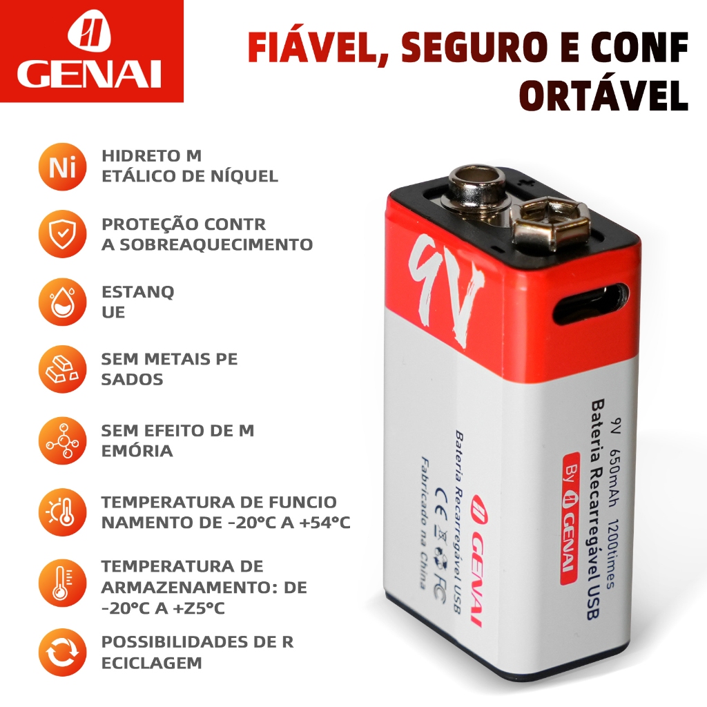 Características Marca: IIgenai Linha: 9V Modelo: GN-375 - 9V RECARREGAVEL Recarregável: Sim Capacidade: 650mAh Forma: Cilindríca Formato de venda: Kit Unidades por kit: 2 Voltagem nominal: 9V Entrada: 5V Ciclo de Uso: 1200 vezes. Carga máxima: 1,5-2 horas. Utilize seus aparelhos por muito mais tempo e com alta eficiência com as Pilhas IIgenai. Produzida com materiais de alta qualidade que garantem durabilidade e ótimo funcionamento dos seus aparelhos eletrônicos. Garantia do vendedor: 1 meses