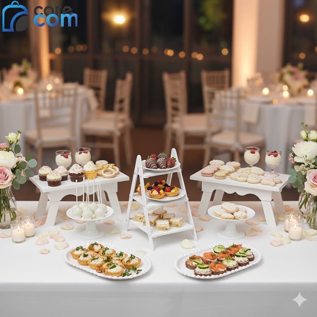 Kit 1 Boleira Cake Renda 22, 2 Mesinhas, 1 Escadinha, 2 Mini Cake, 2 Bandeja Oval Perolada