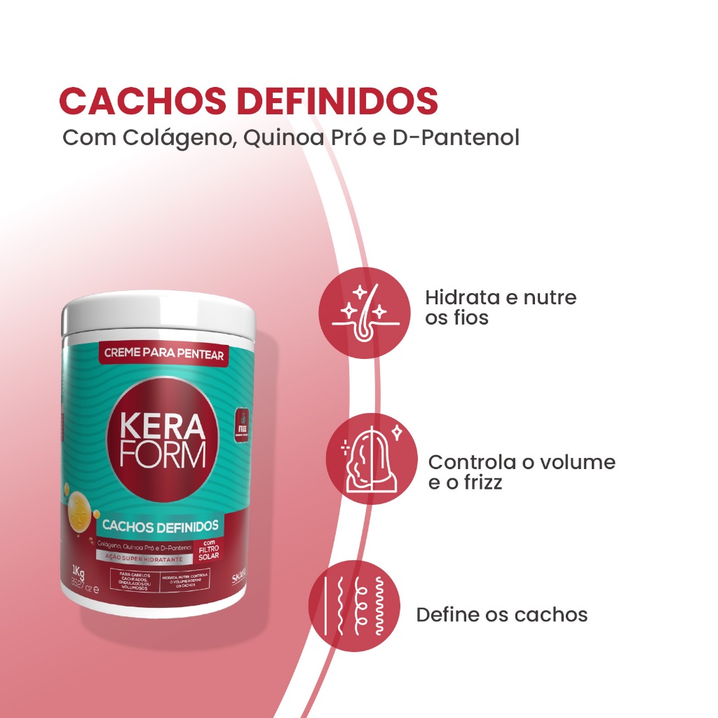 O Creme para Pentear Keraform Cachos Definidos reúne o Colágeno, Quinoa Pró e D-Pantenol, ativos essenciais para a hidratação e restauração dos fios. Fonte de nutrientes superconcentrados, agem controlando o frizz e o volume, mantendo os cachos definidos por mais tempo. Ingredientes: Alfa-Isometil Ionona, Água, Salicilato de Benzila, Álcool Cetearílico, Cloreto de Cetrimônio, Ácido Cítrico, Citronelol, Edetato Dissódico, Octinoxato, Geraniol, Glicerol, Monoestearato de Glicerila, Hexil Cinamal, Colágeno Hidrolisado, Quinoa Hidrolisada, Limoneno, Pantenol, Fragrância, Fenoxietanol, Sorbato de Potássio, Benzoato de Sódio, EDTA Tetrassódico. Uma reposição à altura do seu cabelo! Super Concentradas e de resultado imediato, as Recargas Keraform oferecem um tratamento de recuperação intensiva. Recarga Keraform Ultra Ativada Cachos Definidos é um creme concentrado que deposita proteínas e vitaminas nos fios, promovendo a união das fibras capilares, dando força, elasticidade e texturização aos cabelos.
