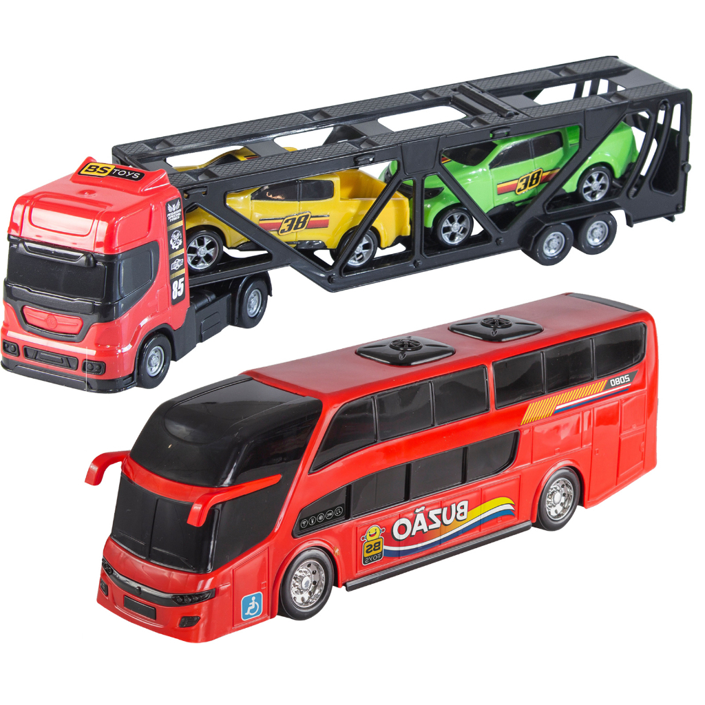 Kit 1 Caminhão Cegonheira Com 2 Carrinhos + 1 Ônibus + 1 Caminhão Cegonha Com 1 Carrinho Veículos Bs Toys