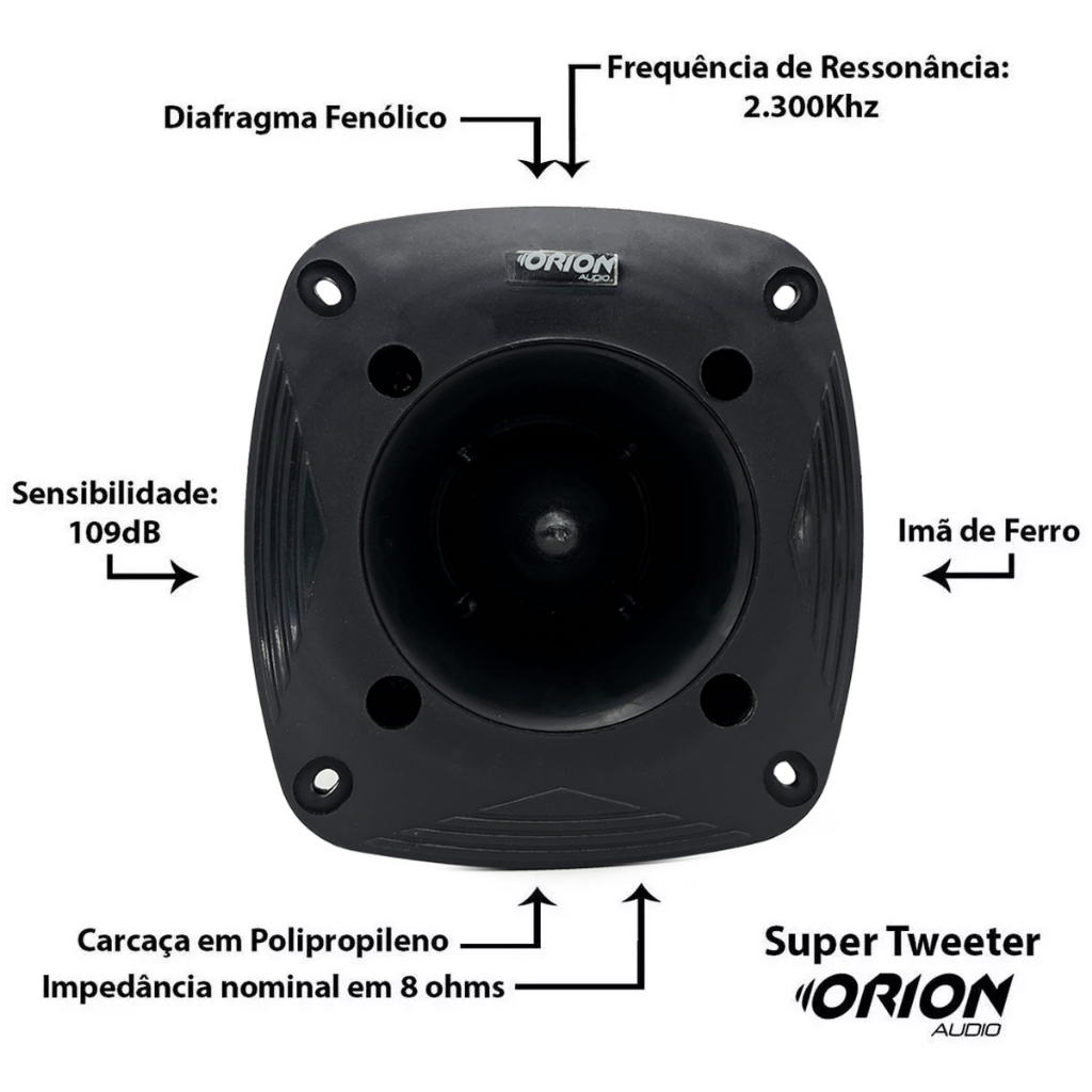 Mais de 15 anos de experiencia no mercado com os melhores produtos e o melhor atendimento! KIT 1 DRIVERS + 1 SUPER TWEETER + 1 CORNETA LONGA Este kit contem 1 driver, 1 tweeter e 1 corneta no total de 240W de potencia RMS, ideal para reproduzir frequencias medias e agudas, com total definicao sonora para o seu projeto de som. Carcaca super resistente e duravel, qualidade e desempenho reunidos em um so kit. Especificacoes tecnicas do Driver: Potencia: 120W RMS (cada) Impedancia Nominal: 8 ohms Sensibilidade driver: 109 Db Resposta de frequencia driver: 800 a 20000Hz Carcaca em Polipropileno Diagrama Fenolico Ima Ferrite de Bario Especificacoes tecnicas do Tweeter: Potencia: 120W RMS (cada) Impedancia Nominal: 8 ohms Sensibilidade tweeter: 111 Db Resposta de frequencia tweeter: 4000 a 20000Hz Bobina Simples Carcaca em Polipropileno Ima Ferrite de Bario Especificacoes tecnicas da Corneta: Corneta Longa 25 cm Fabricado em polipropileno Bocal Redondo Eficiencia de Dissipacao de Frequencias Medias Diametro aproximado da Garganta: 3,5 cm Diametro aproximado da Boca: 15 cm Conteudo da Embalagem: 1 Driver, 1 Super Tweeter e 1 Corneta longa FABRICANTE: ORION AUDIO
