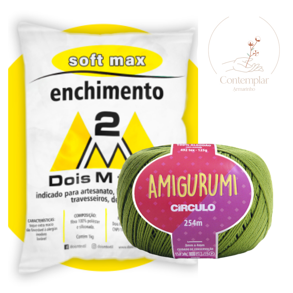 Ei, esse é o produto ideal para você! Trata-se de um Kit com 1 unidade do Amigurumi - Circulo e 100 g de enchimento fibra siliconada SOFT MAX - Dois M Têxtil. **Amigurumi - Circulo** O fio Amigurumi é ideal para crochetar ou tricotar amigurumis. DADOS TÉCNICOS: Composição: 100% algodão mercerizado Quantidade: 1 novelo Peso do novelo: 125 g Comprimento do fio: 254 m Tex: 492 Marca: Circulo AGULHA RECOMENDADA: Tricô: 2,5 - 4,5 mm Crochê: 2,0 - 4,0 mm **Enchimento fibra siliconada SOFT MAX - Dois M Têxtil** A Soft Max é ideal para o enchimento de brinquedos, almofadas, travesseiros, estofados e bichos de pelúcia. * Fibra 100% poliéster * 100% fibra virgem * Inodoro * Toque sedoso DADOS TÉCNICOS: Cor: Branca Peso: 100 g Marca: Dois M Têxtil *Produto enviado em embalagem secundária após ter o seu peso aferido* *Imagem meramente ilustrativa, podendo conter variações de cor devido a luz e monitor utilizado para visualização* Contemplar Armarinho -> Caso você tenha interesse em comprar mais de um produto diferente, entre em contato pelo chat, temos kits disponíveis <-