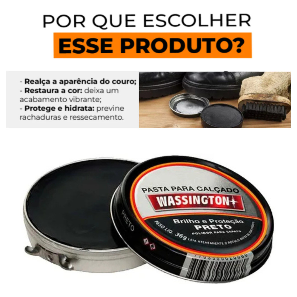 Mantenha seus calçados sempre impecáveis e com aparência de novos com o Polidor de Sapato Pasta Preto Wassington. Este produto é ideal para quem deseja dar um toque especial e profissional ao cuidado de seus sapatos. A embalagem de 36g é perfeita para levar na bolsa e utilizar a qualquer momento, garantindo que seus calçados estejam sempre prontos para impressionar. A Pasta Wassington é reconhecida pela sua qualidade e eficiência, proporcionando um acabamento duradouro e brilhante. Com a escova incluída, você poderá aplicar o produto de maneira prática e uniforme, alcançando todos os cantos dos seus sapatos. A flanela polidora é o toque final para um brilho intenso, deixando seus calçados radiantes. Este polidor é adequado para todos os tipos de couro, realçando a cor e mantendo a flexibilidade do material. Proteja seu investimento em calçados e evite o desgaste prematuro, utilizando este conjunto que combina eficiência e praticidade. Dedique-se ao cuidado dos seus sapatos com a Pasta Wassington e transforme cada passo em uma afirmação de estilo. A rotina de limpeza torna-se simples e rápida, permitindo que você tenha sempre um visual impecável.