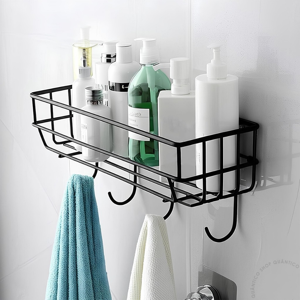 Kit 1 ou 2 Prateleira Organizador Adesivo Com Gancho Preto De Parede Porta Shampoo Sabonete Banheiro