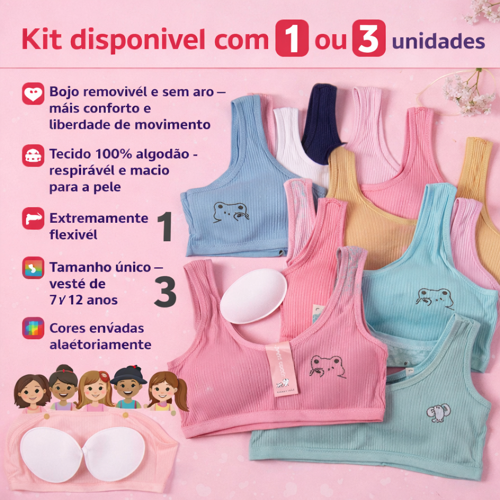 Kit 1 ou 3 Top Sutiã Juvenil com Bojo Algodão Confortável 7 a 12 Anos Sem Aro