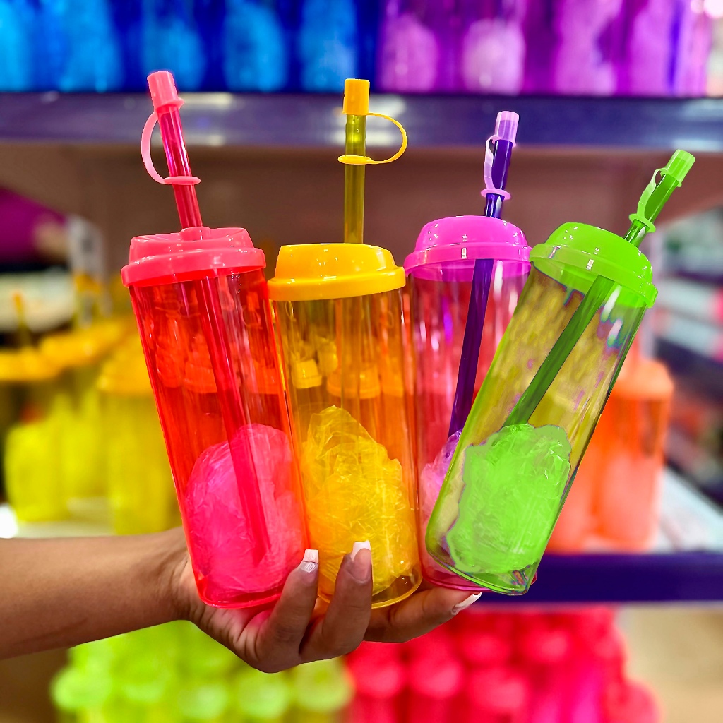 Kit 10 / 15 Copos Long Drink Coloridos com Tampa e Canudo Reutilizável – 320ml - Festa Balada