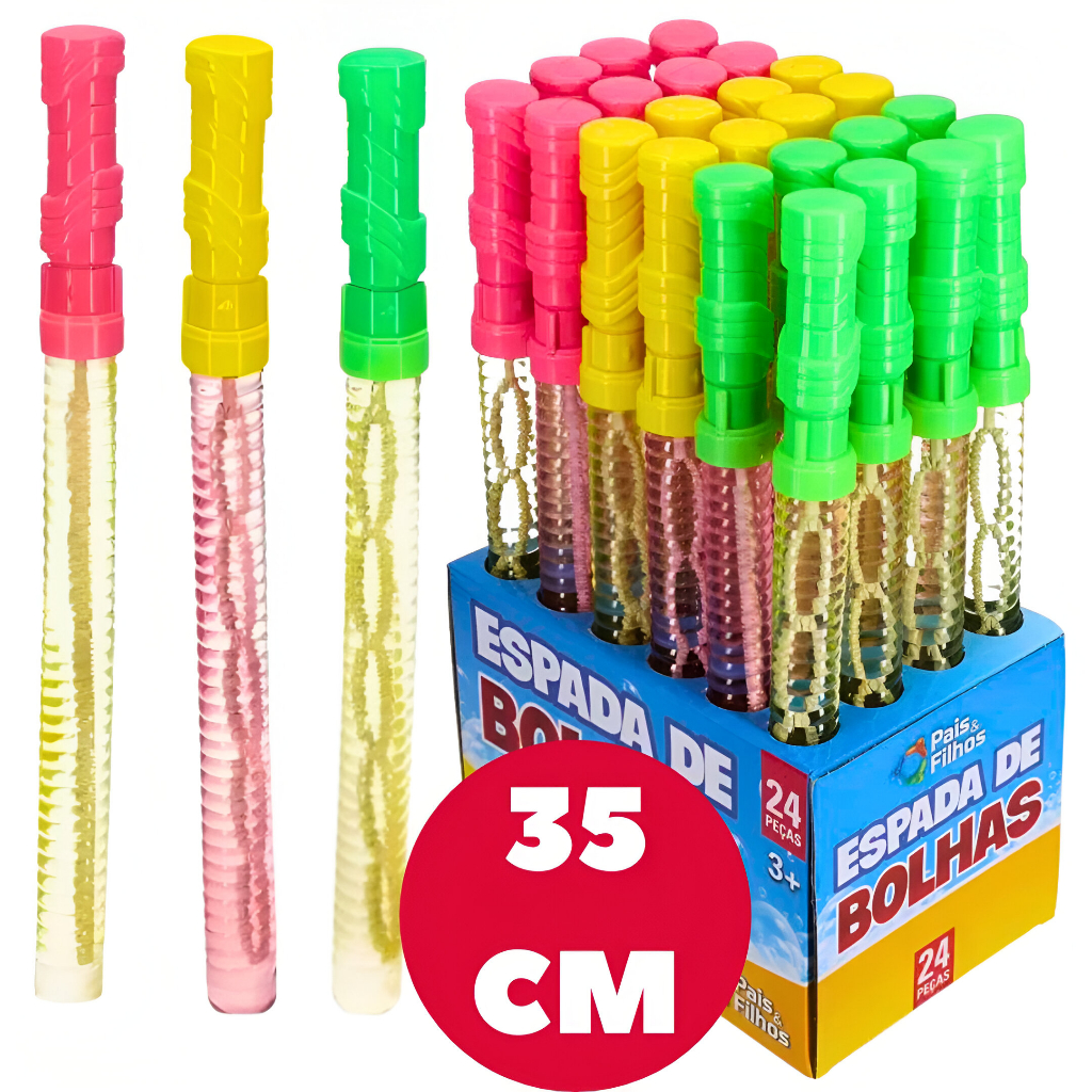 Super Espadas de Bolhas de Sabão Gigantes 35cm – Diversão Garantida! Prepare-se para a brincadeira mais divertida e mágica do momento! Nossas espadas de bolhas de sabão gigantes têm 35cm de puro encanto, ideais para brincar ao ar livre, em festas, piqueniques, praia ou parque. Basta abrir, mergulhar e soprar para criar bolhas enormes e coloridas que encantam crianças e adultos! Perfeitas para lembrancinhas de festa! Cada espada já vem com líquido incluso, pronta para usar assim que chegar — sem bagunça e sem precisar preparar nada! São cores sortidas e vibrantes, ideais para meninos e meninas, deixando qualquer festa ainda mais alegre e especial. Por que escolher nossas Espadas de Bolhas: -Tamanho gigante: 35cm de pura diversão! -Cores variadas – lindas e sortidas para agradar todos os gostos. -Vai com líquido pronto para uso – é só abrir e brincar! -Perfeito para lembrancinhas, festas, brindes e eventos infantis. -Disponível em kit com 50 unidades, com o melhor preço do mercado! Transforme qualquer momento em uma chuva de bolhas e sorrisos com nossas incríveis espadas! DESCRIÇÃO ESPADA BOLHA 35 CM: *Disponíveis nas cores: Rosa, verde e Amarelo * Contém: 1 unidade de bolha de sabão no formato de espada. *Idade recomendada: 3+ *Medida Unit.(cm) -36,5 x 3,0 x 3,0 *Marca: Pais&Filhos. *Composição: PP,PET,ÁGUA E SABÃO. * Quantidade Disponível: 10/20/30/40 e 50 unidades OBS: ANÚNCIO CONTÉM VARIAÇÃO DE QUANTIDADE , ESCOLHA O SEU PREFERIDO.
