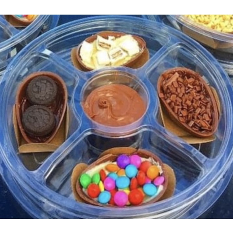KIT embalagem para 4 ovos de Páscoa 50g degustação petisqueira Galvanotek g540 Material: Plástico PET Coloração: Cristal Dimensão Externa: 19,8cm diâmetro x 4,0cm altura BANDEJA PETISQUEIRA DESCARTÁVEL COM TAMPA E 5 DIVISÕES - G540 Linda petisqueira multiuso, muito utilizada por confeiteiras, prática e resistente, acompanha tampa com travas que a fixam na bandeja, proporcionando um transporte seguro e maior proteção dos alimentos, uma excelente escolha para entregas no delivery. Dicas de utilização: Fondue de Brownie com Chocolate, Brigadeiro de Colher, Frutas, Salgadinhos, castanhas, frutas secas, sementes, patês, frios, azeitonas, docinhos, pipocas gourmet, etc.