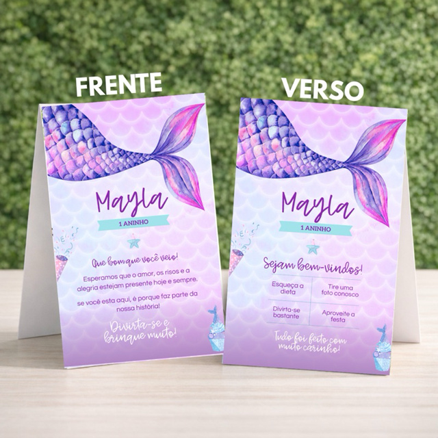 KIT 10 a 30 PLAQUINHAS DE AGRADECIMENTO – TEMA SEREIA ROXA Deixe sua festa ainda mais encantadora com nosso kit de plaquinhas de agradecimento para centro de mesa! Com ilustrações fofas e personalizadas no tema, elas são perfeitas para complementar a decoração e demonstrar carinho aos seus convidados. > Especificações da Plaquinha: - Tamanho: 14 cm x 9,2 cm - Papel Fotográfico Brilhoso, impresso em alta qualidade - Impressão frente e verso ATENÇÃO: - As cores podem sofrer variação entre a tela (celular/computador) e o material impresso, devido à diferença de brilho, contraste e configuração de cada dispositivo. - Nosso material é papel fotográfico brilhoso, que proporciona um acabamento mais vivo, com mais destaque nas cores e brilho. - Ainda assim, podem ocorrer pequenas variações de tonalidade, o que é normal no processo de impressão e não caracteriza defeito. - Não enviamos teste impresso/foto impressa para aprovação. - Confira atentamente sua arte antes do envio. > Produção: - Começa a contar após a confirmação do pagamento - Produto artesanal, feito com muito cuidado e carinho > Entrega: - Garantimos o envio no prazo informado - Atrasos após a postagem são de responsabilidade da transportadora - Recomendamos realizar a compra com antecedência para evitar imprevistos Perfeita para emocionar e demonstrar carinho com um presente simples e cheio de significado!