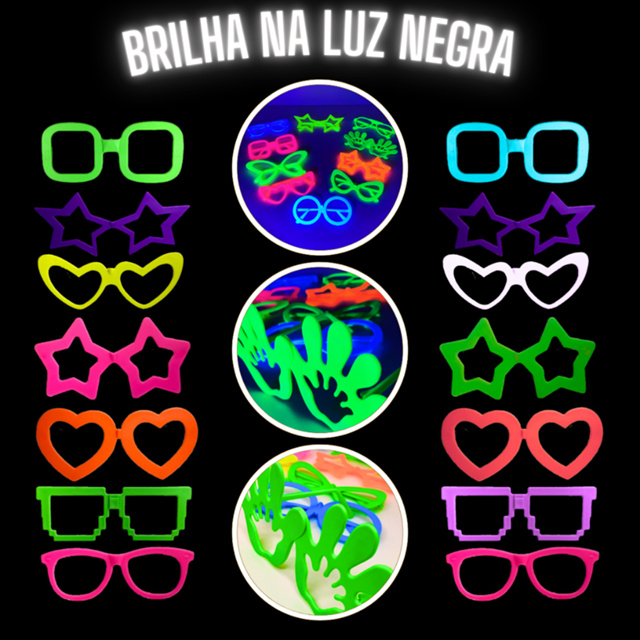 | Kit 10 a 40 Óculos Neon Festa Brilham na Luz Negra, Leves e Confort... este produto | R$ 21,99 | — | 4.9/5 | 214 |