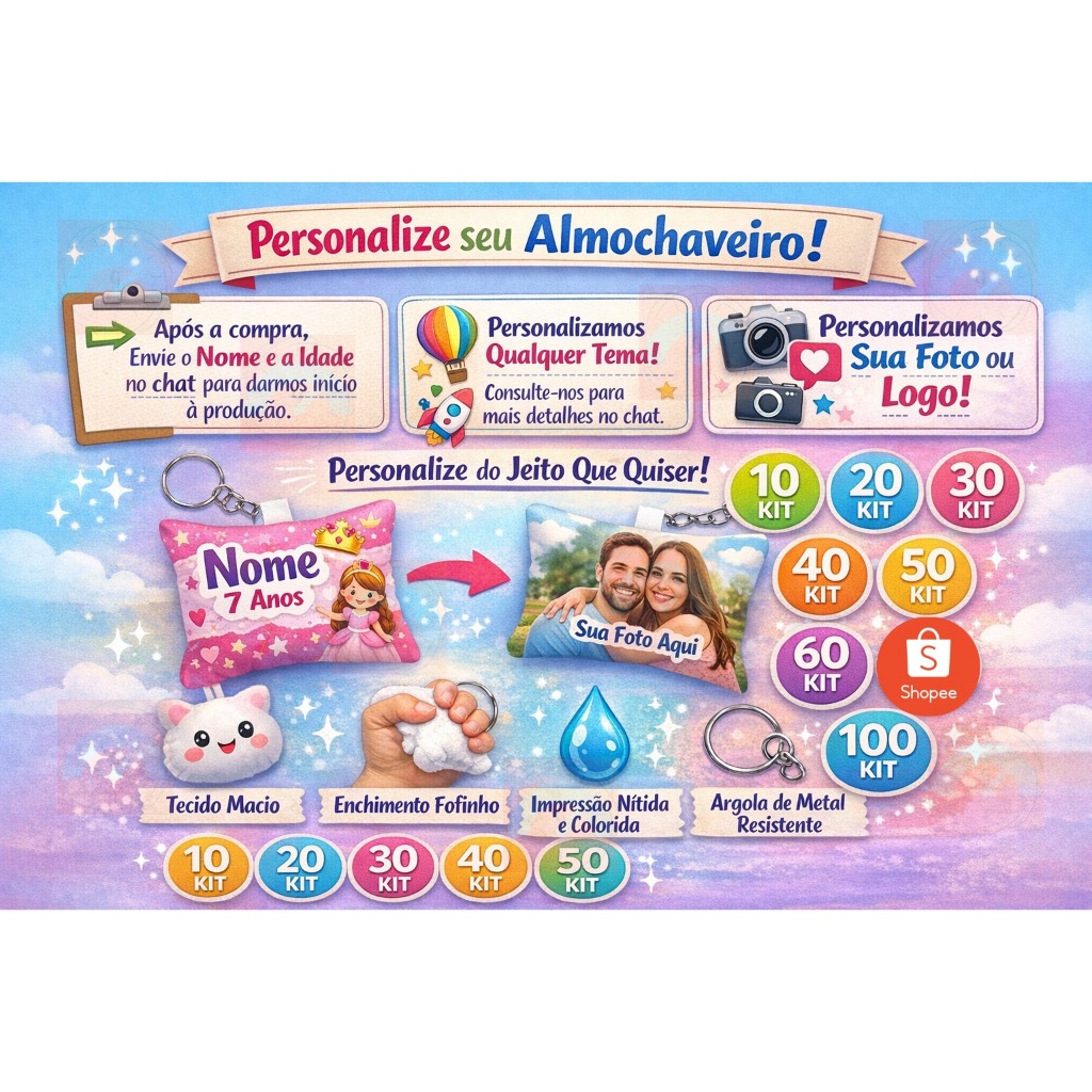 Em diversos temas para todas ocasiões e eventos! Aniversários, casamentos, batizados, chá de bebê, chá de cozinha etc ... Arte inclusa (dois modelos) de acordo com sua escolha e aprovação ou você poderá nos enviar sua arte pronta. (caso já tenha) Feito com muito carinho! Detalhes do produto: Material: Oxford Medida: 7cm x 7 cm Enchimento: fibra siliconada Antialérgica Imagem impressa nos dois lados *Pode ser lavado* Como escolho a arte ou frase que eu quero? *Após realizar a compra um chat de conversa será liberado para acertar os detalhes da sua encomenda e arte, você poderá escolher um dos modelos no tema preferido que temos disponível ou solicitar a criação, no caso são duas opções para sua escolha. Pode ser confeccionado com foto ou sua imagem favorita. **Realizando a compra, você já poderá deixar especificado como prefere, que nosso departamento de arte estará entrado em contado *Quero enviar uma foto ou imagem, como faço? Você poderá enviar sua foto ou imagem pelo chat **Pedimos por gentileza que seja específico com os detalhes da arte, pois muitas mudanças podem atrasar o andamento da produção, tenha certeza no momento que aprovar a arte, pois a mesma não poderá ser mudada depois de já aprovada. Verifique bem no momento da aprovação da arte, pois não iremos nos responsabilizar por erros gráficos após a aprovação da mesma. Tenha ciência do prazo de confecção do produto + o tempo de entrega não realize a compra, caso não tenha certeza de que chegará a tempo, pois não é justo pedir devolução por falta de atenção do prazo, pois nossos produtos são personalizados e característicos, não podendo ser mais aproveitado por nós caso queira devolvê-lo.