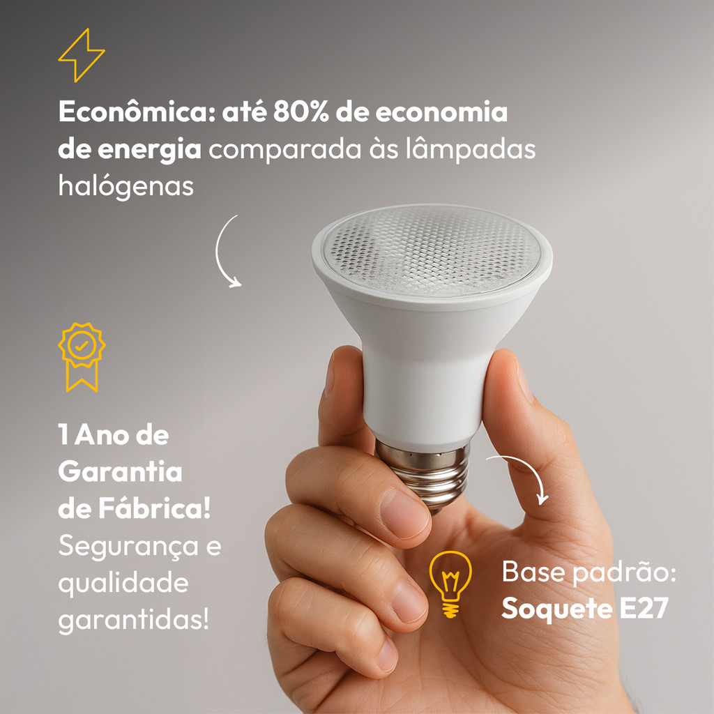 A linha de lâmpadas LED PAR20 da Alut By Avant é ideal para iluminação de destaque ou decorativa, substituindo com eficiência as lâmpadas halógenas PAR20. O modelo oferece um desempenho excelente com baixo consumo de energia. Propriedades: Kit contendo 10 unidades de lâmpada Corpo em material plástico resistente Difusor translúcido para uma luz suave e uniforme Possui driver interno isolado, garantindo maior segurança e durabilidade Características de Funcionamento: Temperatura ambiente de operação: -5°C a 40°C Tensão de entrada: 100V a 240V (Bivolt automático) Fator de potência: >0,70 Baixo consumo de energia Especificações Técnicas: Potência: 7W Fluxo Luminoso: 525 lúmens Eficiência Luminosa: 75 lúmens/W Base: E27 Temperatura de Cor: 4000K (Branco Neutro) Dimensões (mm): A: 63,5 / B: 83 Equivalência: 50W Incandescente / 50W Halogena Ângulo de Abertura: 38° Garantia: Este produto possui garantia oficial de 12 meses da marca Alut By Avant contra defeitos de fabricação, contados a partir da data da compra. É necessário apresentar o cupom ou a nota fiscal para acionar a garantia. Sobre a Marca: A Alut By Avant é uma marca reconhecida no mercado de iluminação, com um compromisso com a qualidade e a inovação. Seus produtos são projetados para oferecer alto desempenho, eficiência energética e durabilidade, garantindo a satisfação e a segurança dos seus clientes.
