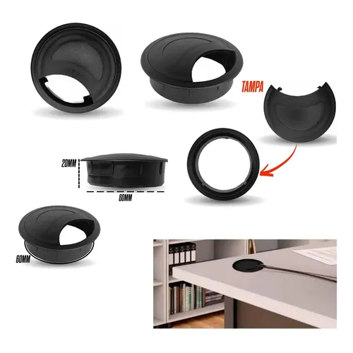 Kit 10 Acabamento Passa Fio Redondo Preto Mesa Moveis 60mm