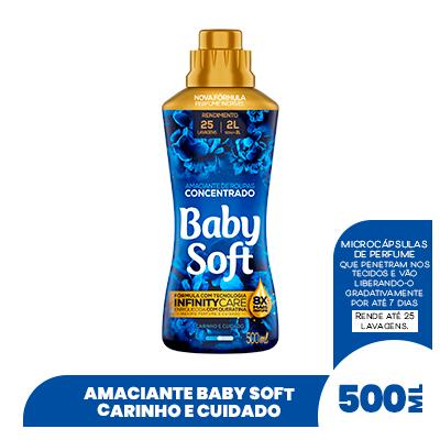 Com os Amaciantes Concentrados Baby Soft você economiza muito mais! Ele rende muito e pode fazer até 25 lavagens. Descrição Média 1.Vantagens O Amaciante Concentrado Baby Soft Carinho e Cuidado é um dos campeões de vendas da Baby Soft. Tudo isso por possuir fragrância suave e manter suas roupas macias e perfumadas por mais tempo. Com apenas meio litro dos Amaciantes Concentrados Baby Soft você pode fazer até 25 lavagens. Além de todo este poder, eles têm uma formulação especial com cápsulas de perfume que são ativadas durante a lavagem, para que o seu efeito seja prolongado e o perfume dure por mais tempo. 2.Características do produto (medidas/especificar quando houver variação do mesmo produto) Os nossos amaciantes concentrados possuem 8 X mais perfume e são formulados com queratina em sua composição, que permite muito mais maciez e profundo cuidado com as fibras dos tecidos! Sem falar que todas as nossas embalagens são feitas de plástico PET, permitindo reciclagem de 100% do material. Baby Soft é uma marca consciente e sustentável! Mas afinal, o que é um amaciante concentrado? Vem cá que eu te conto! Apesar de ter uma embalagem menor que a versão tradicional, o amaciante concentrado costuma render muito mais, pois sua fórmula possui mais ativos do que água, ou seja, com menos produto você tem mais maciez e perfume. Além desses benefícios, o Amaciante concentrado Baby Soft é: Hipoalergênico Dermatologicamente testado Garante o cuidado que você e sua família merecem. Produto não testado em animais Detalhes técnicos: Unidade: Embalagem com Amaciante Concentrado Baby Soft Carinho e Cuidado 500ML Dimensões da embalagem: 8cm(L)x 6cm(P)x22cm(A) Vida útil: 24 meses 3.Composição (do que é feito o produto)/ Especificações técnicas Sal De Amônio Quaternário Coadjuvante Conservante Corantes Fragrâncias Veículo Descrição Longa 4. Modo de usar (o da embalagem) Siga sempre as instruções de lavagem contidas nas etiquetas das roupas e nunca despeje o produto diretamente sobre as roupas. Após uma operação de lavagem, realize mais um enxágue, dissolvendo em separado 1/2 tampa de Baby Soft em água limpa e sem resíduo de sabão. Deixe agir por 10 minutos e complete o processo. 5. Dica de Gê Se você busca saber qual amaciante é melhor, eu conto pra você! Existem os amaciantes diluídos e os concentrados, e Baby Soft oferece os dois pra você! O amaciante tradicional ou clássico é aquele encontrado com mais facilidade nas prateleiras. Ele é diluído em água e, geralmente, vem em garrafas de 500ml a 5 litros. É um dos tipos mais práticos para o dia a dia, já que vem pronto, ou seja, basta acrescentar à sua lavagem. Já a versão concentrada do produto é também líquida, porém mais espessa do que o amaciante tradicional. O seu nome se dá porque ele tem menos água na sua fórmula, portanto, o produto é mais puro, logo, mais concentrado. Ele rende uma quantidade maior de lavagens do que a sua versão diluída e, por conta da concentração, deve ser usado em quantidades menores.