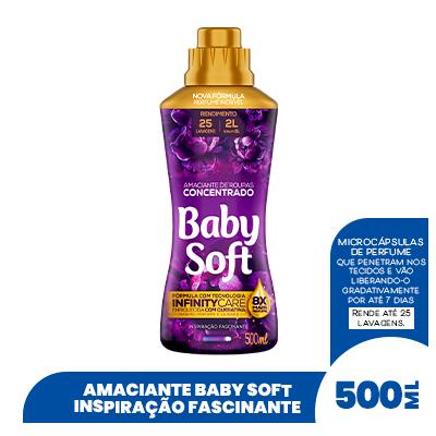 O Amaciante Concentrado Baby Soft Inspiração Fascinante foi pensado para quem quer maciez e suavidade, mas não abre mão de um perfume marcante e duradouro nas roupas. Com apenas meio litro dos amaciantes Concentrados Baby Soft você pode fazer até 25 lavagens. Descrição Média 1.Vantagens Rende até 25 lavagens. Além de todo este poder, eles têm uma formulação especial com cápsulas de perfume que são ativadas durante a lavagem, para que o seu efeito seja prolongado e o perfume dure por mais tempo. 2.Características do produto (medidas/especificar quando houver variação do mesmo produto) Os nossos amaciantes concentrados possuem 8 X mais perfume e são formulados com queratina em sua composição, que permite muito mais maciez e profundo cuidado com as fibras dos tecidos! Sem falar que todas as nossas embalagens são feitas de plástico PET, permitindo reciclagem de 100% do material. Baby Soft é uma marca consciente e sustentável! Mas afinal, o que é um amaciante concentrado? Vem cá que eu te conto! Apesar de ter uma embalagem menor que a versão tradicional, o amaciante concentrado costuma render muito mais, pois sua fórmula possui mais ativos do que água, ou seja, com menos produto você tem mais maciez e perfume. Além desses benefícios, o Amaciante Concentrado Baby Soft é: Hipoalergênico Dermatologicamente testado Garante o cuidado que você e sua família merecem. Produto não testado em animais Detalhes técnicos: Unidade: Embalagem com Amaciante Concentrado Baby Soft Inspiração Fascinante 500 ml Dimensões da embalagem: 8cm(L)x 6cm(P)x22cm(A) Vida útil: 24 meses 3.Composição (do que é feito o produto)/ Especificações técnicas Sal De Amônio Quaternário Coadjuvante Conservante Corantes Fragrâncias Veículo Descrição Longa 4. Modo de usar (o da embalagem) Siga sempre as instruções de lavagem contidas nas etiquetas das roupas e nunca despeje o produto diretamente sobre as roupas. Após uma operação de lavagem, realize mais um enxágue, dissolvendo em separado 1/2 tampa de Baby Soft em água limpa e sem resíduo de sabão. Deixe agir por 10 minutos e complete o processo. 5. Dica de Gê Se você busca saber qual amaciante é melhor, eu conto pra você! Existem os amaciantes diluídos e os concentrados, e Baby Soft oferece os dois pra você! O amaciante tradicional ou clássico é aquele encontrado com mais facilidade nas prateleiras. Ele é diluído em água e, geralmente, vem em garrafas de 500ml a 5 litros. É um dos tipos mais práticos para o dia a dia, já que vem pronto, ou seja, basta acrescentar à sua lavagem. Já a versão concentrada do produto é também líquida, porém mais espessa do que o amaciante tradicional. O seu nome se dá porque ele tem menos água na sua fórmula, portanto, o produto é mais puro, logo, mais concentrado. Ele rende uma quantidade maior de lavagens do que a sua versão diluída e, por conta da concentração, deve ser usado em quantidades menores.