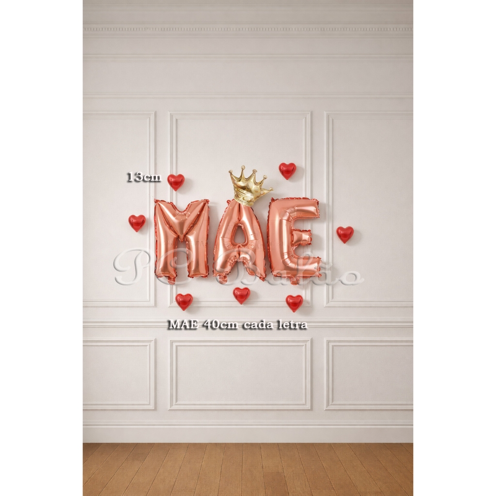Kit 10 Balão Metalizado ( 3 Letras MAE ROSE GOLD ) + 6 Coração 13cm VERMELHO + 1 COROA DIA DAS MÃES