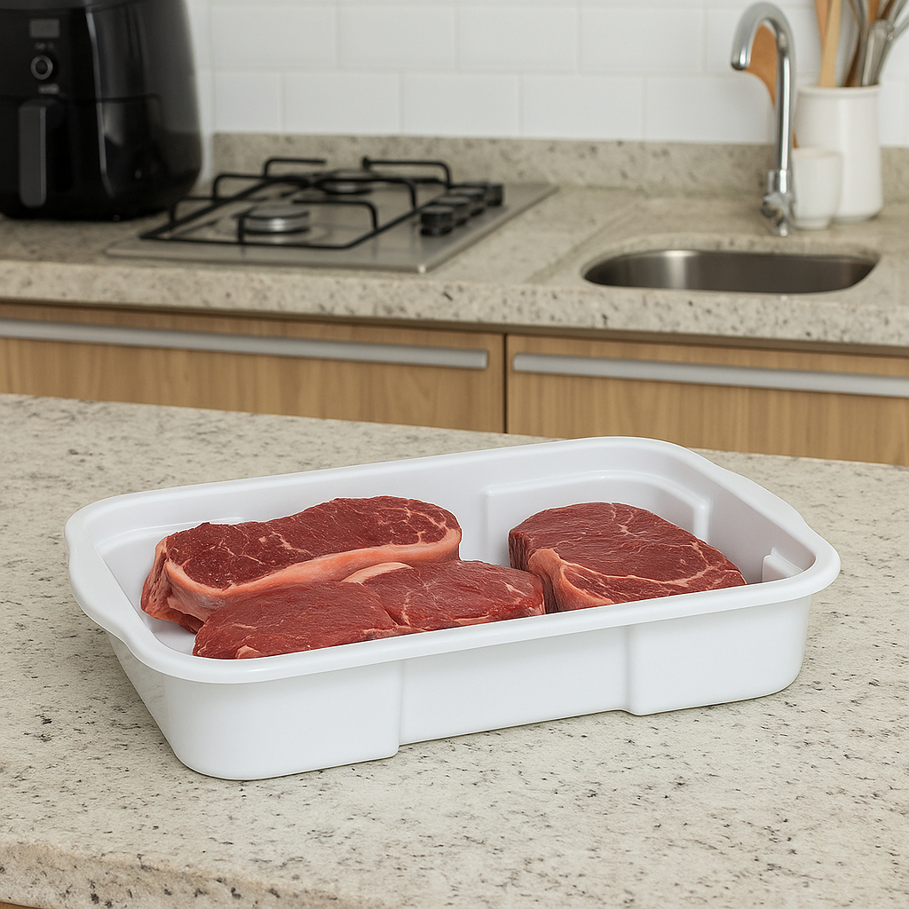 Kit 10 Bandejas Plásticas 6L 🍗 Armazenamento prático e empilhável! Características do produto: ✅ Capacidade de 6L por bandeja – 40x27x7cm ✅ Feitas em plástico resistente de alta durabilidade ✅ Design empilhável que economiza espaço ✅ Ideais para carnes, salgados, doces e congelados ✅ Fácil de limpar com superfície lisa Você vai receber em sua casa: 📦 10x Bandejas plásticas de 6 litros Recomendações de Uso: 👉 Utilize para armazenar alimentos em geladeiras ou freezers 👉 Empilhe corretamente para otimizar o espaço 👉 Evite uso em micro-ondas ou fornos 👉 Lave com esponja macia para maior durabilidade