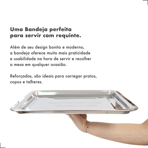 Kit com 10 Bandejas em Inox 36x27cm - Acabamento Espelhado. Ideal para Bares, Restaurantes e Hotéis. As Bandejas em Inox da QAP STORE possuem alta qualidade, resistência e lindo acabamento, combinando com diversos ambientes e trazendo mais sofisticação na hora de servir. Além de seu design bonito e moderno, a bandeja oferece muito mais praticidade e usabilidade na hora de servir e recolher a mesa pois são reforçadas e possuem ótima pegada, sendo ideais para carregar pratos, copos, talheres e jogos de chá. Informações Adicionais: - Material: Aço Inox de excelente qualidade - Design funcional com abas para facilitar o transporte - Medidas aproximadas: 36x27x2cm - Quantidade por pacote: 10 bandejas Em caso de dúvidas, não hesite em perguntar. Temos uma equipe pronta para te atender e garantir 100% de satisfação. Atenciosamente, QAP STORE.