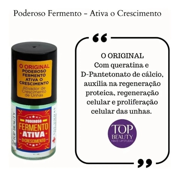 O kit contém 10 unidades Concreto Base Endurecedora com Formol, suas unhas nunca mais irão morrer. Super D-Tone Complexo vitamínico Fortalecedor para Unhas mais frágeis, permite que você recupere a vitalidade de suas unhas e beleza. Poderoso Fermento Ativa o Crescimento Só o Ativador de Crescimento de Unhas Top Beauty, possibilita que suas unhas cresçam de maneira rápida e extremamente saudável. Xi Lascou O Complexo vitamínico Fortalecedor para Unhas Quebradiças da Top Beauty, atua no fortalecimento das suas unhas, garantindo que eles nunca mais quebrem. Cerinha - Hidratante de cutículas e unhas A Top Beauty especializada no ramo de cosméticos, atua no mercado desde 2005 sendo referência em produtos de beleza de extrema qualidade e preço justo. O objetivo de levar a beleza e confiança para a casa das brasileiras proporciona a excelência de seus produtos. A marca Top Beauty contribui para um viés cruelty-free, assim garantimos que os produtos comercializados não são testados em animais. Sendo assim SÓ a Top Beauty proporciona a você, a alta qualidade de seus produtos, aquela make duradoura, arrasadora que destaca sua beleza e cuida da sua pele. Além disso, a marca trás versatilidade podendo ser utilizada tanto no dia-dia quanto em ocasiões mais especiais. Sua durabilidade, marca presença em todas as situações permitindo que você se destaque sempre.
