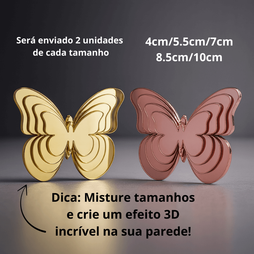 Kit 10 Borboletas Em Acrílico Espelhado Decoração Fita Dupla Face Grande e Pequena 4cm a 10cm