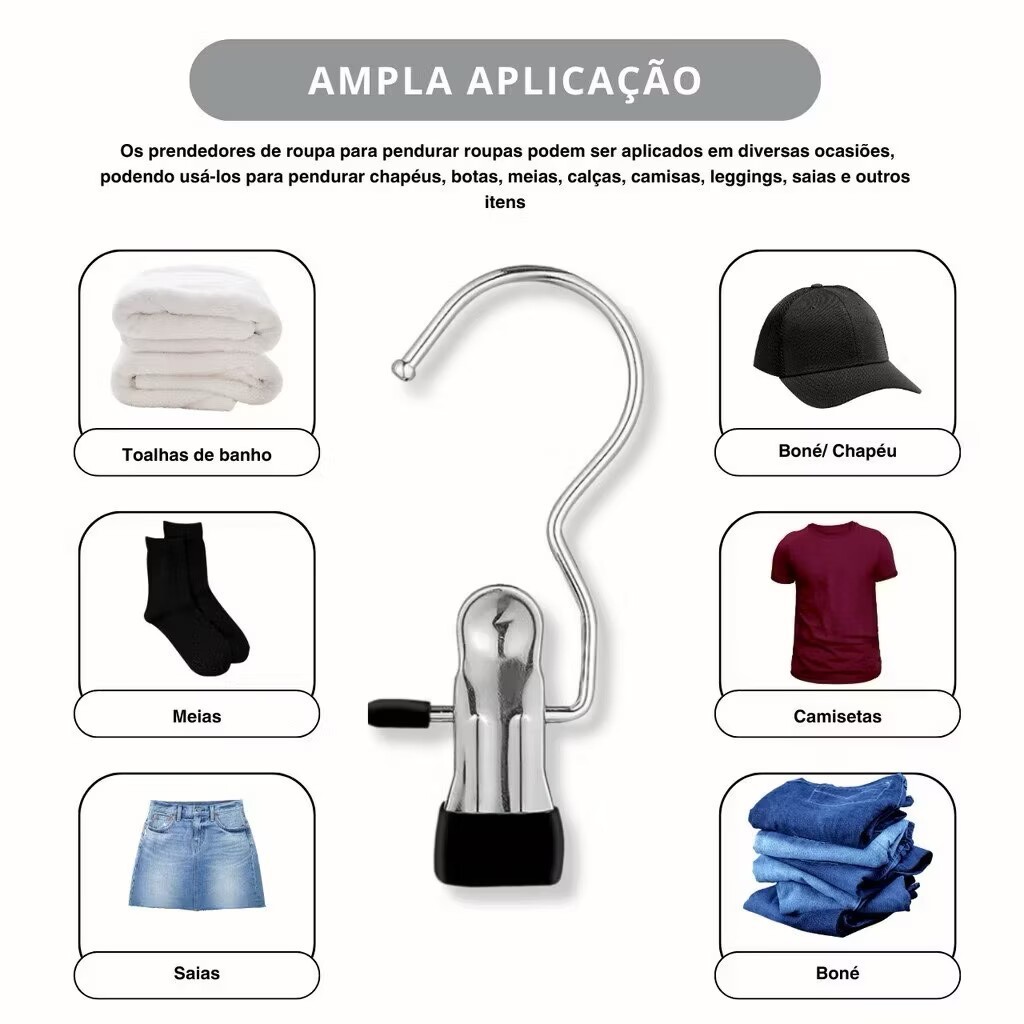 😊Gancho-Clamp de Inox com Rotação 360° – Arrumador de Armário que Economiza Espaço, 2 em 1 e Protege as Roupas! Ainda se preocupa com armário lotado, roupas escorregando ou deixando marcas? Este gancho-clamp de inox é simultaneamente um gancho e um clamp — design de rotação 360° + fixação firme, resolve todos os problemas de organização de roupas com praticidade, economizando espaço e protegendo suas peças! ⭐✅ Pontos Principais: 1 Peça = Gancho + Clamp, Organização Mais Eficiente Design Multifuncional com Rotação 360°: Gancho gira livremente, funcionando tanto como suporte (para prender em varas de armário) quanto como clamp (para fixar roupas). 2 em 1, adaptado a diferentes cenários de organização; Inox Durável e Anti-Ferrugem: Gancho espessado cromado + corpo de clamp metálico, resistente à ferrugem e corrosão, com alta capacidade de carga e sem deformação. Seguro e estável mesmo com uso prolongado; Mola Forte + Boca de Clamp com Borracha Suave: Mola interna com força de fixação superior, prendendo roupas firmemente sem escorregas. Boca do clamp revestida com borracha macia, anti-derrapante e sem danificar as peças (sem marcas, sem arranhar tecidos) — ideal para malhas, cetim, calças jeans e diversos tipos de tecidos; Rei da Economia de Espaço: Tamanho compacto permite suspensão densa, comportando mais roupas em uma única vara de armário, "ampliando" seu armário com facilidade; Resistente à Água e Durável: Material impermeável e à humidade, perfeito para suspender toalhas no banheiro ou roupas para secar na varanda — adaptado a cenários úmidos e secos. ⭐✅ Múltiplos Cenários de Uso: Tudo Pode Ser Prendido/Suspenso Organização de Armário: Prenda calças, saias, cachecóis; suspenda chapéus, camisas, meias — adeus a pilhas de roupas; Banheiro/Varanda: Suspenda toalhas, fronhas, roupas íntimas — secagem rápida e sem mofo; Embalagem para Viagem: Tamanho pequeno após dobrar, pode ser preso na mala para fixar roupas, evitando rugas; Itens Domésticos: Prenda documentos, suspenda pequenos objetos, ou fixe luvas de cozinha na cozinha — praticidade em excesso! ⭐✅ Especificações do Produto Material: Inox cromado + boca de clamp com borracha suave Dimensões: Comprimento total de cerca de 10,5cm, largura da boca do clamp de 2,2cm (adaptado à maioria das espessuras de roupas) Funcionalidades: Rotação 360°, 2 em 1 (gancho + clamp), anti-derrapante e proteção para roupas 🌙✅ Por Que Escolher Este Produto? Diga adeus aos problemas dos cabides tradicionais:❌ Escorregam facilmente | ❌ Difíceis de equilibrar | ❌ Inflexíveis | ❌ Ocupam muito espaço✅ Prendem firmemente | ✅ Economizam espaço | ✅ Rotação 360° | ✅ Sem marcas nas roupas 🛒 Conteúdo da Embalagem1 Kit (conforme especificação real, ex: 10 unidades/kit) de Gancho-Clamp de Inox com Rotação 360° Use este "arrumador mágico" para deixar seu armário mais organizado, suas roupas mais duráveis e a organização mais prática e tranquila!