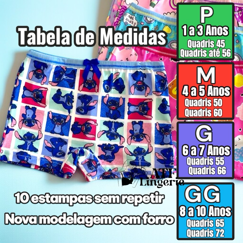 Segue a descrição atualizada: ATF LINGERIE Kit com 10 Calcinhas shortinho Boxer Infantil Feminina Estampadas sortidas Forro 100% Algodão Antialérgico • Disponível em kits com 10 unidades • Tamanhos: P, M, G e GG. • Modelagem confortável, ideal para o dia a dia. • Estampas variadas e divertidas para alegrar a rotina das pequenas. • Forro em algodão antialérgico, garantindo maior cuidado e conforto para a pele. ATF LINGERIE 📏 Tabela de Medidas – Infantil P – 1 a 3 anos • Quadril: 45 cm • Quadril até: 56 cm M – 4 a 5 anos • Quadril: 50 cm • Quadril até: 60 cm G – 6 a 7 anos • Quadril: 55 cm • Quadril até: 66 cm GG – 8 a 10 anos • Quadril: 65 cm • Quadril até: 72 cm ATENÇÃO ATF LINGERIE INFORMA: Não realizamos trocas por erro de medidas. Por favor, confira a tabela de medidas ou consulte o vendedor via chat da Shopee. Se precisar de mais ajustes, é só pedir!