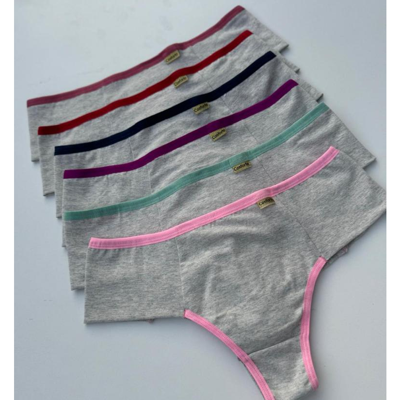 Essa é a nossa calcinha Elô, linda e confortável. Lateral dupla e fio duplo não marca na roupa. Peça na cor mescla (cinza) com aviamento com cores variadas. Neste kit contém 10 calcinhas. Calcinhas embaladas individualmente. Composição- tecido: 92% algodão 8% elastano forro: 100% algodão •Tamanhos: M (36 á 38) Altura: 26cm Cintura: 65cm Quadril: 80cm G (40 á 42) Altura:28cm Cintura: 70cm Quadril: 85cm GG (44) Altura: 30cm Cintura: 75cm Quadril: 90cm