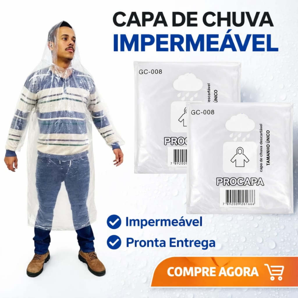 ☔ Capa de Chuva Descartável Transparente – Prática e Leve ✅ Características do Produto -Capa de chuva descartável e transparente -Fabricada em polietileno resistente -Material leve, flexível e confortável -Modelo unissex -Possui capuz integrado para maior proteção -Tamanho único, veste adultos e adolescentes -Dobra compacta, fácil de guardar em bolsas, mochilas ou porta-luvas 🌧️ Proteção e Conforto -Protege contra chuva leve e moderada -Mantém roupas e objetos secos -Transparência permite visualização da roupa por baixo -Não esquenta excessivamente por ser material fino 🎯 Indicações de Uso -Ideal para shows, eventos ao ar livre, festivais e passeios -Perfeita para uso urbano, caminhadas e deslocamentos -Indicada para motoboys, ciclistas e pedestres -Excelente opção para viagens, camping e emergências 📦 Conteúdo da Embalagem 10, 5 e 3 unidades capa de chuva descartável transparente (Selecione a quantidade desejada) 📐 Especificações Técnicas -Material: Polietileno (PE) -Cor: Transparente -Fechamento: Modelo tipo poncho (sem botões) -Reutilização: Uso limitado / descartável ⭐ Vantagens -Ótimo custo-benefício -Fácil transporte -Uso imediato -Indispensável para imprevistos climáticos