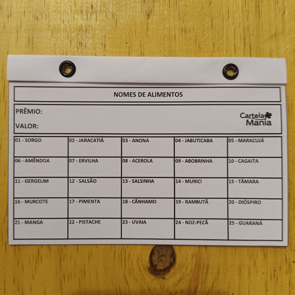 KIT DE CARTELAS NUMERADAS: • Se você quer organização, credibilidade e apresentação impecável, esse é o modelo ideal. Produzidas com gerador próprio exclusivo, com mais de 200 nomes distintos, praticamente zerando repetições idênticas. ESTRUTURA REFORÇADA: • Fechamento com ilhós + arruela de alumínio. • Não abre sem deixar marca. • Estrutura firme e resistente. • Padrão profissional de acabamento. ESPECIFICAÇÕES TÉCNICAS: • 25 itens por cartela. • Papel Offset 150g. • Tamanho 14cm x 9,5cm. • Produto físico. TEMAS DISPONÍVEIS: • Números • Alimentos • Animais • Cidades • Pessoas • Times • Misto (temas sortidos exceto números) IDEAL PARA QUEM QUER: • Organização séria • Material profissional • Melhor apresentação • Estrutura segura • Produto pronto para uso OBS: Pode haver variação na cor do ilhós.