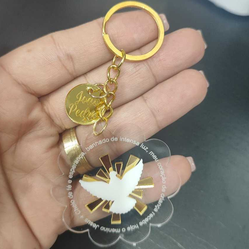✨ Kit Chaveiro Crisma Batismo Eucaristia Personalizado com Nome + Cartão Lembrancinha Transforme momentos sagrados em recordações eternas com nosso lindo kit personalizado 🙏 💫 Descrição: Cada chaveiro é feito com acrílico de alta qualidade (2mm), trazendo um design delicado com o Espírito Santo em destaque dourado ✨ Acompanha cartão personalizado com nome, data e mensagem especial — perfeito para Batismo, Crisma ou Primeira Eucaristia 💖 ✅ Ideal para lembrancinhas de cerimônias religiosas ✅ Personalização com o nome do homenageado ✅ Acabamento dourado elegante e sofisticado ✅ Cartão com mensagem de fé e gratidão Frases para o acrílico: “Sabedoria, entendimento, conselho, fortaleza, ciência, piedade e temor de Deus.” “Cheio de fé e esperança, banhando de intensa luz, meu coração de criança recebe hoje Jesus.” 📏 Tamanho aproximado: 6,5 cm 🎁 Kit disponível em múltiplas quantidades – perfeito para eventos e celebrações O CHAVEIRO ACOMPANHA CARTÃO E EMBALAGEM. 💛 Um mimo abençoado que encanta corações e guarda um pedacinho desse momento tão especial!