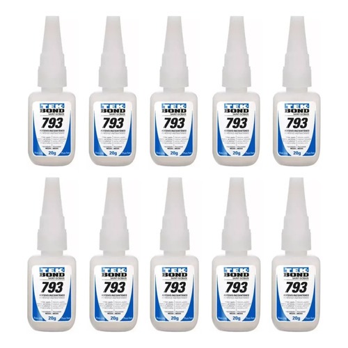 - Produto a PRONTA ENTREGA com envio IMEDIATO! - Envio em menos de 12 horas - Atendimento exclusivo - suporte ao cliente pós compra Adesivo Cola Instantâneo 793 20g Tek Bond - KIT com 10 Unidades CARACTERÍSTICAS: É um produto já finalizado. Para utilizar basta aplicar a cola entre as superfícies da peça e pressionar por pelo menos 20 segundos. Após este tempo a peça já pode ser utilizada novamente, lembrando que o processo total pode levar até 24 horas para manter a firmeza do material. Adere à diversos tipos de materiais, como compostos de borracha, EPDM, borracha nitrílica, Neoprene, EVA e Viton. É um adesivo multiuso, com alta aplicação no setor moveleiro e industrial. MODO DE USO: Para obter um resultado satisfatório as superfícies devem estar limpas e isentas de óleo e sujeira. Deve-se aplicar uma camada fina de adesivo em apenas 1(um) dos lados da peça a serem colados, pois o excesso prejudica o desempenho do adesivo. PRECAUÇÕES: A utilização em excesso prejudica o funcionamen to do produto. Em contato com a pele e olhos é extremamente perigosa, pois pode grudar em pouco segundos. MANTENHA FORA DO ALCANCE DAS CRIANÇAS. DADOS TÉCNICOS: - Viscosidade (cP): 80 a 120; - Temperatura de Trabalho (°C): -55 a 80; - Preenchimento de Folgas (mm): Até 0,10; - Resistência ao Cisalhamento (Aço x Aço): = 100Kgf/cm2; - Base química: Etilcianoacrilato; - Aparência na forma líquida: incolor a levemente amarelado; - Aparência na forma sólida: incolor; - Solúvel em: Mek, Acetona, Nitrometano. Bateu aquela dúvida? Não hesite em perguntar! Estamos sempre a disposição pré e pós compra Aguardamos ansiosamente por sua compra ;) Quantidade:5 Tamanho Do Pacote:20g/gr
