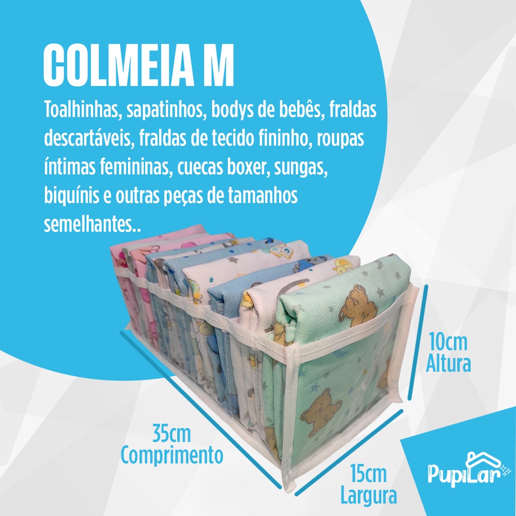 KIT COM 10 COLMEIAS ORGANIZADORAS DE GAVETAS PUPILAR 04 UNIDADES TAMANHO P (10cm X 12cm X 35cm) - 3P 03 UNIDADES TAMANHO M (10cm X 15cm X 35cm) - 3M 03 UNIDADES TAMANHO G (10cm X 25cm X 35cm) - 4G Acabe com o estresse se livre da bagunça, as Colmeias Pupilar vão te ajudar! Com as nossas Colmeias suas roupas ficam super organizadas e fáceis de visualizar. Chega de ter que procurar a suas roupas preferidas no fundo das gavetas. As Colmeias Pupilar são fabricadas em um Plástico Cristal Premium transparente, que dão excelente visibilidade na hora de procurar suas roupas. São flexíveis e muito resistentes. ENVIAMOS PARA TODO O BRASIL DESPACHAMOS SEU PEDIDO EM MENOS DE 24 HORAS ALGUMAS RAZÕES PARA COMPRAR OS ORGANIZADORES PUPILAR: 1- Maximiza o espaço: Nossos organizadores de gavetas são projetados para aproveitar ao máximo o espaço disponível em seu guarda-roupas. 2- Durabilidade e qualidade: Nossos organizadores são feitos de materiais duráveis e de alta qualidade, projetados para resistir ao uso diário e manter suas roupas e acessórios protegidos. Com acabamentos cuidadosamente projetados, nossos organizadores são elegantes e funcionais, adicionando um toque de estilo ao seu guarda-roupas. 3- Versatilidade: Nossos organizadores são versáteis e se adaptam facilmente às suas necessidades de organização. Com opções de tamanhos e configurações diferentes, você pode escolher o organizador que melhor se adapte as suas gavetas, seja ele grande ou pequeno, e personalizá-lo de acordo com suas preferências. 4- Com nossos organizadores , você pode transformar seu espaço de armazenamento em um ambiente organizado e funcional, facilitando a escolha de suas roupas e acessórios, e mantendo tudo em ordem. Invista em organizadores de qualidade e desfrute de um guarda-roupas organizado e prático todos os dias! Entre em contato conosco agora e descubra como nossos organizadores podem fazer a diferença no seu guarda-roupas! * FICHA TÉCNICA COLMEIA P * QUANTIDADE DE NICHOS: 10 DIMENSÕES: 10cm Altura X 12cm Largura X 35cm Comprimento COR DO VIÉS: Branco GARANTIA: 90 DIAS CONTRA DEFEITOS DE FABRICAÇÃO INDICAÇÃO DE USO: Peças pequenas como Cuecas, Calcinhas Roupinhas de bebê, bodys de bebê, roupas de praia, gravatas, lenços, Cintos e peças de tamanhos semelhantes. * FICHA TÉCNICA COLMEIA M * QUANTIDADE DE NICHOS: 10 DIMENSÕES: 10cm Altura X 15cm Largura X 35cm Comprimento COR DO VIÉS: Branco GARANTIA: 90 DIAS CONTRA DEFEITOS DE FABRICAÇÃO INDICAÇÃO DE USO: Toalhinhas, sapatinhos e bodys de bebês, fraldas descartáveis, fraldas de tecido fininho, roupas íntimas femininas, cuecas boxer, sungas, biquínis, Panos de prato e outras peças de tamanhos semelhantes. * FICHA TÉCNICA COLMEIA G * QUANTIDADE DE NICHOS: 10 DIMENSÕES: 10cm Altura X 25cm Largura X 35cm Comprimento COR DO VIÉS: Branco GARANTIA: 90 DIAS CONTRA DEFEITOS DE FABRICAÇÃO INDICAÇÃO DE USO: Camisetas, Blusinhas, Bermudas de tactel (masculina e feminina), Toalhas de Bebê, Fraldas de Bebê, Mantas, Cueiros e outras peças com tamanhos semelhantes. DÚVIDAS FREQUENTES: P: Essa Colmeia G serve para calça jeans? R: Não, a Colmeia recomendada para calça jeans e bermudas é o modelo JEANS(GG) (20x25x40). P: Produto tem garantia? É possível devolver? R: Todos os nossos produtos dispõem de 3 meses de garantia contra defeitos de fabricação. Se tiver alguma dúvida, entre em contato conosco através do chat, será uma satisfação ajudar. Ótimas Compras!