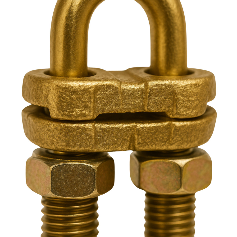Bem Vindo à Efforce Metais! O conector Grampo Terra Duplo, com parafuso em U. Item ideal para conexão entre haste-cabo, por aperto. Alta condutividade elétrica e resistência à corrosão. Permite conectar um condutor à 90º em relação a haste ou tubo IPS. Aplicações: - Ideal para sistemas de aterramento em projetos residenciais, comerciais e industriais. - Utilizado em instalações elétricas, sistemas de proteção contra descargas atmosféricas (SPDA), entre outros. Especificações Técnicas: - Material: Liga de Cobre Estanhado - Diâmetro da Haste: 1/2 a 5/8 polegadas - Tipo de Conexão: Dupla