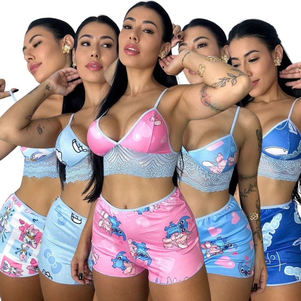 Kit 10 Conjunto Short Doll Curto Pijama de Dormir Estampado Feminino Personagem Sem Bojo Cropped Virginia