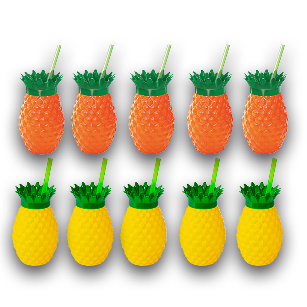 Kit 10 Copos Formato Abacaxi Laranja e Amarelo Com Canudo Festa Tropical Moana