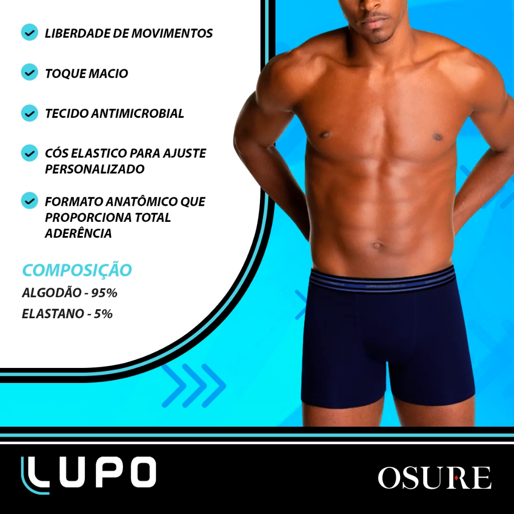 ITENS INCLUSOS: - 10 Cuecas Boxer Lupo em Algodão - Ref: 523-088 Produto 100% original, com garantia. DESCRIÇÃO DO PRODUTO: A Cueca Boxer Lupo possui o comprimento mais alongado que ajuda a definir melhor o corpo na região do púbis, glúteos e coxas. Outras vantagens são a maleabilidade da malha, que permite movimentos amplos e não segura suor e calor, como pode acontecer com tecidos sintéticos. Ela possui uma seleção de cores discretas, bonitas e versáteis. Foi desenvolvida com a mais moderna tecnologia, o que diminui os pontos de fricção e superaquecimento. Também possui ventilação estratégica em zonas críticas de suor, proporcionando alto conforto térmico. O calor e umidade são transferidos rapidamente do corpo para o ambiente externo. O algodão de alta qualidade, trabalhado com a alta tecnologia da indústria têxtil, inibe a formação e proliferação de microrganismos, proporcionando frescor prolongado e conforto. CARACTERISTICAS: - COMPRIMENTO ALONGADO: Ajuda a definir melhor o corpo nas regiões do púbis, glúteos e coxas. - CONFORTO E LIBERDADE DE MOVIMENTO: Permite movimentos amplos e não retém suor e calor. - TECNOLOGIA AVANÇADA: Reduz pontos de fricção e superaquecimento. - VENTILAÇÃO ESTRATÉGICA: Em zonas críticas de suor, proporcionando conforto térmico. - TRANSFERÊNCIA DE CALOR E UMIDADE: Rápida dissipação do calor e umidade para o ambiente externo. - FRESCOR PROLONGADO: Algodão de alta qualidade inibe a formação de microrganismos, garantindo frescor duradouro. TAMANHOS: COMPOSIÇÃO: - Cinza Mescla: 85% Algodão / 10% Poliéster / 5% Elastano. - Demais cores: 95% Algodão / 5% Elastano. POSTAGEM: Se o pagamento for confirmado até as 11:00, postamos o pedido no mesmo dia. Exceto sábados, domingos e feriados. INSTITUCIONAL: Há mais de 10 anos no mercado oferecendo a melhor experiência, a Osure é líder de vendas nos marketplaces e continua crescendo mês a mês, sempre prestando um bom atendimento a um preço justo. São mais de 2 milhões de pedidos e clientes bem atendidos. Trabalhamos somente com produtos originais e priorizamos a agilidade na entrega do produto e qualidade no atendimento, visando proporcionar a melhor experiência possível para nossos clientes.