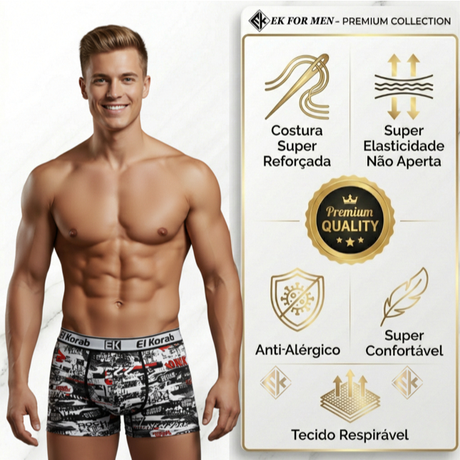 Atualmente, uma das principais reclamações dos homens no dia a dia são em relação à qualidade de suas cuecas. Alguns reclamam de cuecas com tecidos desconfortáveis, que limitam os movimentos e causam assaduras na região da virilha. Alguns reclamam do calor que sentem ao longo do dia, pelo fato do tecido não ser respirável. Já outros, reclamam dos tamanhos que não se ajustam ao corpo. Uma coisa é certa: a maioria dos homens necessita de um alto padrão de qualidade em suas peças íntimas, principalmente para enfrentar os dias longos de trabalho. Mas fique tranquilo. Você, homem, veio no lugar certo. Nós temos a solução perfeita para todos os homens que precisam de boas cuecas, com a melhor qualidade do mercado, em termos de tecido e serviço, por um preço superacessível, que cabe no bolso de qualquer um. **Tamanhos do Produto:** - Trabalhamos com os Tamanhos adulto P, M, G e GG. >> Para saber qual tamanho é ideal se baseie na tabela abaixo: P - Veste manequim do 32 ao 34. M - Veste manequim do 36 ao 38. G - Veste manequim do 40 ao 42. GG - Veste manequim do 44 ao 46. Obs.: Para manequins a partir de 48 olhe a linha Plus Size em nossa loja. **Informações do Produto:** - A El Korab preza pela boa experiência do cliente em primeiro lugar. Todos os nossos produtos são desenhados visando o conforto e a durabilidade. - As nossas cuecas são fabricadas com Tecido de Microfibra, respirável, na composição 92% Poliéster e 8% Elastano, com forro interno de 100% de Algodão. Todos os nossos produtos são originais, patenteados e de fabricação própria. - Nossas peças são atrativas e de qualidade e podem ser adquiridas para a revenda em varejo local. Ou seja, se você trabalha como varejista, o nosso preço pode atender suas demandas. - *Detalhe Importante (Atenção)*: Não é possível escolher as estampas que compõem o kit. O envio das mesmas ficará sujeito a disponibilidade de estoque. **Principais Benefícios:** - Fáceis de vestir; - Respiráveis; - Se ajustam ao corpo; - Não limitam os movimentos; - Não causam assadura. **Especificações do Produto:** 1. Materiais: Poliéster com Elastano; 2. Estampas: Sortidas; 3. Pacote com 10 unidades. **Sobre a El Korab:** - A El Korab é uma loja que tem paixão em conectar os homens com o que há de melhor no mundo das cuecas sem a necessidade de sair de casa. - Nós vendemos produtos de altíssima qualidade, que tornarão a sua vida mais confortável, e o melhor de tudo: a preços acessíveis. Levamos com a comodidade de comprar online todas as tendências direto para o conforto do seu lar. - Desde o momento em que você faz o seu pedido, até na hora da entrega, queremos garantir que você tenha uma excelente experiência. - Todos os nossos produtos são originais, patenteados e de fabricação própria. Por isso oferecemos os melhores produtos, o melhor serviço e o melhor preço do mercado.