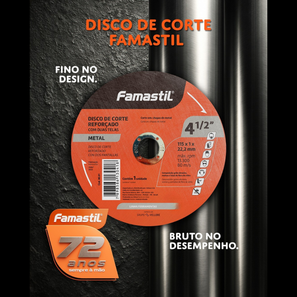 Kit com 10 Discos de Corte para Metal Reforçados 4.1/2 – Famastil Garanta cortes precisos e eficientes com o Kit de 10 Discos de Corte Famastil! Com diâmetro de 115 mm e 22 mm de furo central, eles são compatíveis com esmerilhadeiras, proporcionando excelente desempenho no corte de metais como barras de ferro e chapas. Fabricados com material reforçado, oferecem durabilidade, resistência e alta performance, permitindo cortes rápidos e seguros. O design otimizado garante mais produtividade, sendo a escolha ideal tanto para profissionais quanto para quem realiza trabalhos em casa. Produto novo e de qualidade Marca de confiança: Famastil Ideal para cortes em metal com precisão Invista em eficiência e qualidade para os seus projetos com a linha de discos de corte Famastil!