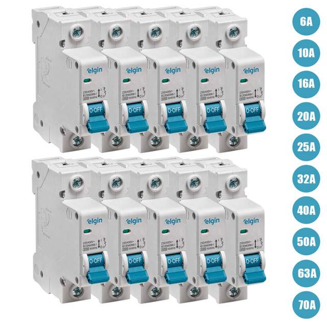 Kit 10 Disjuntor Monopolar Elgin 6A até 70A 1 Polo Din Curva C Bivolt Homologado Inmetro