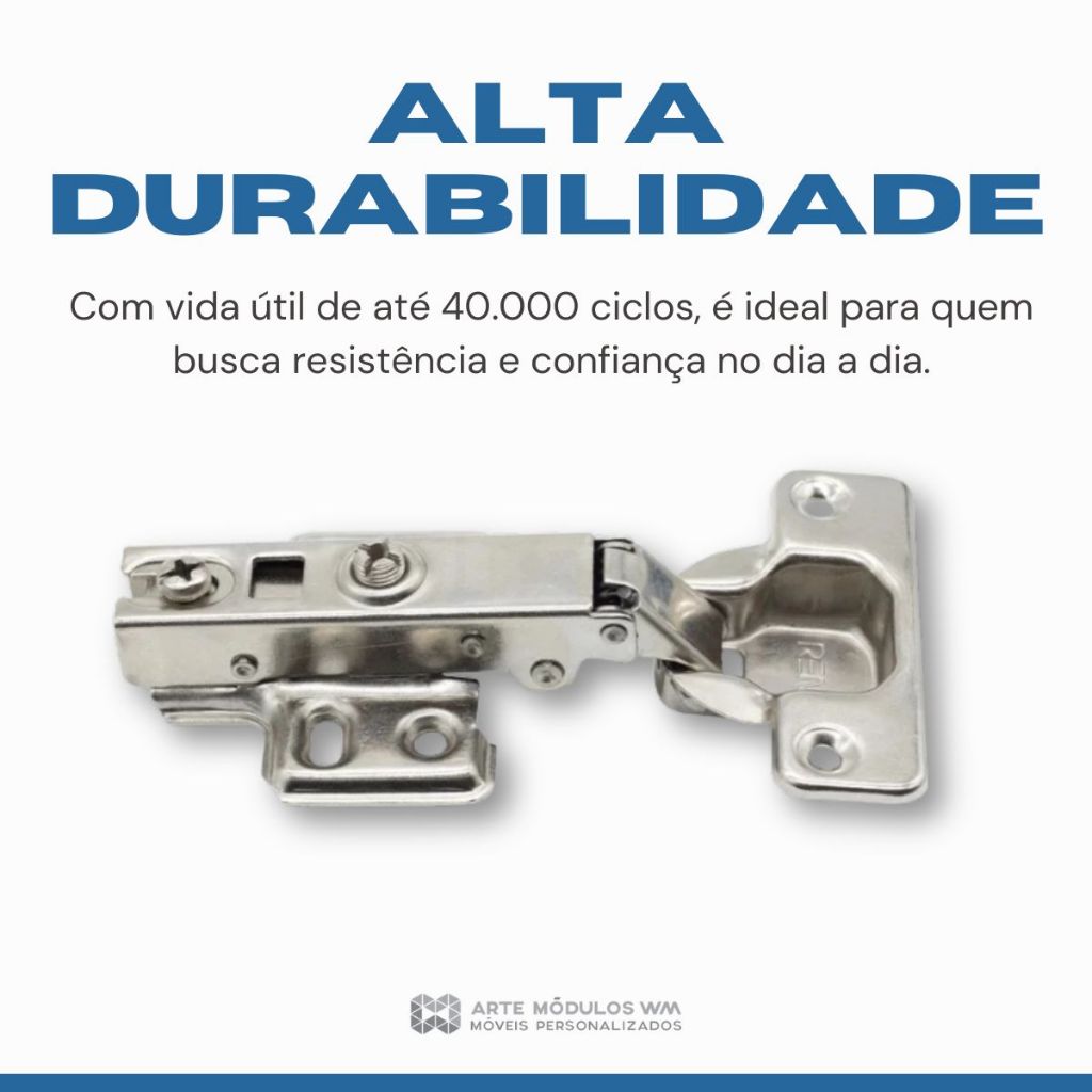 Nós da Arte Módulos WM temos como compromisso oferecer produtos de qualidade e soluções eficientes para o seu dia a dia. Nossa missão é garantir sua satisfação com produtos confiáveis e um atendimento de excelência! KIT COM 10 - 35mm Dobradiça Premium Slide On Soft Close – Reta ou Curva - Eleve o padrão dos seus móveis com a Dobradiça Premium Slide On Soft Close da Metalnox. Desenvolvida com alto padrão de acabamento, essa dobradiça proporciona fechamento suave e silencioso, preservando a integridade dos móveis e aumentando a durabilidade das portas. Com aplicação prática, excelente durabilidade e vida útil de até 40.000 ciclos, ela oferece resistência e versatilidade para diferentes formatos de portas. O sistema soft close evita impactos que causam desgaste, garantindo mais proteção para o conteúdo armazenado. Ideal para quem busca confiança, beleza e qualidade nos acabamentos. Conte com a Arte Módulos WM para garantir qualidade e segurança em seus projetos. Se precisar de ajuda, estamos à disposição para oferecer o melhor suporte! Palavras-chave: Dobradiça 35mm com amortecedor, Dobradiça soft close para armário, Dobradiça com fecho suave, Dobradiça reta curva super curva, Dobradiça para porta de armário, Dobradiça com calço fixo, Dobradiça slow close, Dobradiça para móveis planejados, Dobradiça com sistema de amortecimento, Dobradiça de alta durabilidade.
