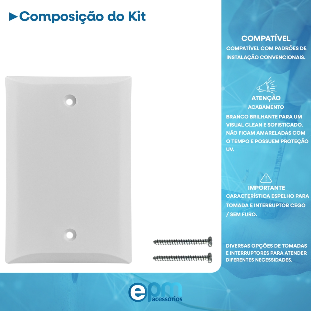 Espelho Placa Sem Furo Cego Para Tomada Interruptor Branca Descrição do produto: Espelho Placa Branca Cega Sem Furo Para Tomada Interruptor Produto com Certificado do Inmetro -MR-OCP-0370 Característica: Espelho Para Tomada e Interruptor Cego / Sem Furo Marca: EPM ACESSORIOS Material: Termoplástico (PVC) Cores: Branco Brilhante Com Parafusos para fixação e ajuste Dimensões: 8,5cm de Largura x 13cm Altura Informações importantes: As Placas / Espelhos não ficam amarelados com o tempo e possuem proteção UV. A montagem é rápida, fácil e contam com um PVC brilhante de alta resistência e com parafusos para fixação. Dúvidas Frequentes ------------------------------------------------------------------------------------------------- 1 - Os produtos são novos? R: Todos os produtos que comercializamos são produtos novos e com garantia. 2 - A mercadoria está disponível à pronta entrega? R: Todas as mercadorias são para pronta entrega. 3 - O produto acompanha nota fiscal? R: Toda a mercadoria é acompanhada de nota fiscal emitida para o CPF/CNPJ informado na compra. 4 - Como são realizadas as entregas? R: As entregas poderão ser realizadas via Correios ou Transportadoras. As entregas realizadas via transportadora podem não ter código de rastreio. 5 - O produto pode ser retirado? R: Sim, nos anúncios que exibirem essa opção. 6 - Os produtos possuem garantia? R: Todos os produtos possuem garantia mínima de 3 meses conforme o código do consumidor. ------------------------------------------------------------------------------------------------- - ATENÇÃO PARA OS DADOS DE ENTREGA: - Importante conferir: - Dados cadastrais (endereço de entrega, nome completo e CPF ou CNPJ) pois o faturamento será realizado de acordo com esses dados mencionado; - Número de Telefone para Contato - Confirmar se selecionou o frete para envio, pois existe a opção de retirada em nossa loja; - Horário de Atendimento: - De Segunda à Sexta das 8h00 às 18h00.