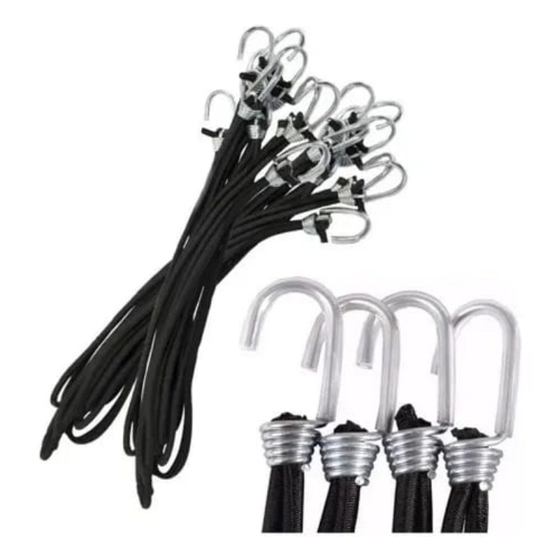 EXTENSOR ELÁSTICO PARA LONA DE CAMINHÃO 10 UNIDADES Aplicação: Recomendado para prender lonas de caminhão, cargas em bagageiros de motos e bicicletas, caminhonetes e veículos em geral. Utilizado para transportes rodoviários, uso doméstico, esportivo, camping, pesca e outros. Interior: Látex. Revestimento: Fios de polipropileno de alta tenacidade. Espessura: 5 milímetros. Comprimento: 35 cm normal 70 cm esticado. Cor: Preto. Gancho: Ferro zincado com proteção de borracha.