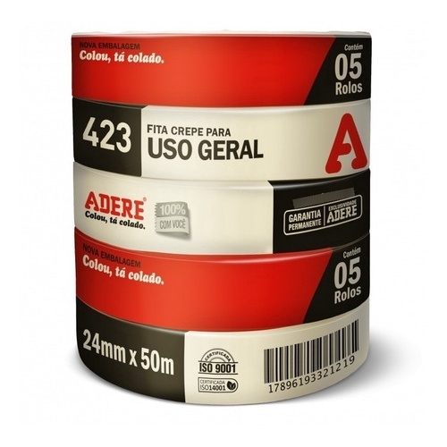 Fita Adere Tapefix modelo 423 - 24mm de largura por 50 metros de comprimento. Ideal para empapelamentos imobiliarios. Características: Cor: Palha claro. Embalagem: Filme plástico encolhível / Caixa de despacho. Dados Técnicos: Adesão ao aço: Mínimo 110 gf/cm; Tack rolling ball: Máximo 30,0 cm; Resistênca à tração: Mínimo 1,8 kgf/cm; Alongamento: Mínimo 4,0 %. -Aplicações: Trabalhos escolares; Fechamento de pacotes leves; Reforço de embalagens; Fixação de papéis ou plásticos; Escritório / Doméstico; Pintura imobiliária. A Fita Crepe Uso Geral 423, não é indicada para o uso em pintura automotiva. Remover dentro de 24h após aplicação. Recomendada para ambiente interno. Estocagem: Na embalagem original, em ambiente coberto, seco e temperatura ambiente. Produto sensível a umidade e luz solar direta. Validade indeterminada. Garantia permanente.