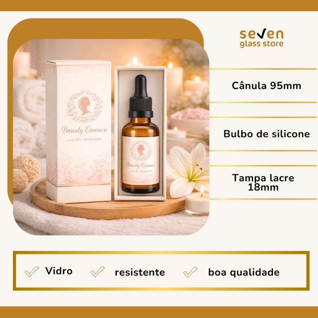 Seja bem vindo ! Esse frasco de vidro é ideal para florais, aromaterapia, homeopatia em geral, essências de vapers, pigmentos e apiário. O frasco em vidro âmbar é indicado para materiais que possuem sensibilidade a luz, acompanhando a tampa plástica com lacre que garante a vedação do produto e garantindo que o produto não foi violado, o bulbo e a cânula complementam com um ótimo sistema de gotejamento. Itens Inclusos na Caixa: • 10 unidades do Frasco de Vidro 50ml na cor Âmbar • 10 unidades do Conjunto conta gotas (Tampa com lacre, Bulbo de silicone e Cânula de vidro) Especificações do Frasco: • Altura total: 12 cm • Diâmetro: 3,3 cm • Diâmetro da rosca: 18mm • Capacidade Útil: 50ml • Matéria prima: Vidro • Área de Rotulagem: 6,5 cm Especificações do Conjunto Conta Gotas: • Tampa plástica COM LACRE diâmetro 18mm • Bulbo de silicone • Cânula de vidro 95mm