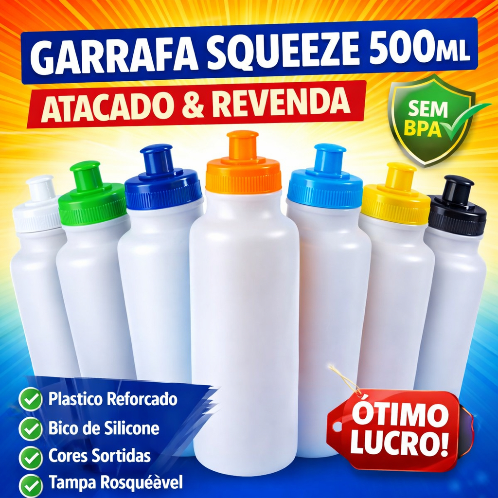 💧 Hidrate-se com praticidade no dia a dia! Esse Kit com garrafas squeeze de 500ml é ideal para quem quer um produto leve, resistente e com ótima saída. Perfeito para revender, montar kits, brindes e também para uso diário. 🎯 IDEAL PARA: 🏋️ Academia | 🎒 Escola | ⚽ Eventos | 🏢 Empresas | 🎁 Brindes | 🏠 Uso doméstico | 🛍️ Revenda ✅ VANTAGENS DO PRODUTO ✨ Plástico reforçado (mais durável) 🚫 Livre de BPA (mais seguro para bebidas) 🔒 Tampa rosqueável (fecha bem e evita vazamentos) 👄 Bico de silicone (macio e confortável) 🎒 500ml (tamanho ideal para mochila e bolsa) 💰 Ótimo custo-benefício (kit com 30 unidades — excelente pra revenda!) 💰 PERFEITO PARA QUEM REVENDE 📌 Produto leve e fácil de enviar 📌 Alta procura em academias, escolas e eventos 📌 Ótimo para montar kits promocionais e brindes 🎨 CORES SORTIDAS ➡️ Informe as cores na aba “Mensagem para o vendedor” antes de finalizar a compra, pois não conseguimos verificar pelo chat. ⚠️ ATENÇÃO (LEIA!) ❌ Não personalizamos. ✅ A garrafa aceita transfer (caso você queira personalizar por conta própria). 🔥 Para aplicação: usar primer e temperatura máxima no rolo de 240°C (medido com pistola térmica infravermelha). 📌 ESPECIFICAÇÕES 🥤 Capacidade: 500ml 🧴 Material: plástico reforçado (livre de BPA) 🔒 Tampa: rosqueável 👄 Bico: silicone