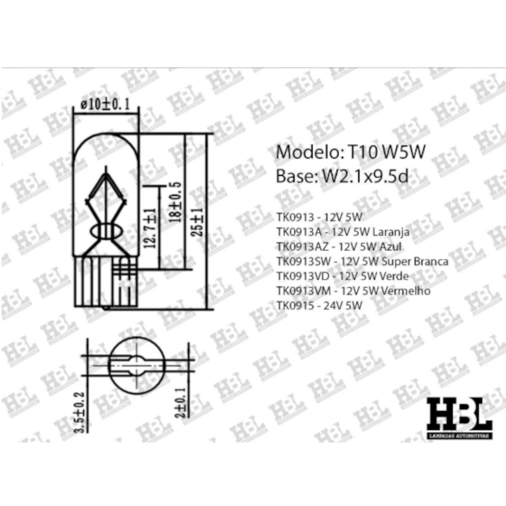 Kit 10 Lâmpada HBL Pingão 2825 12V 5W
