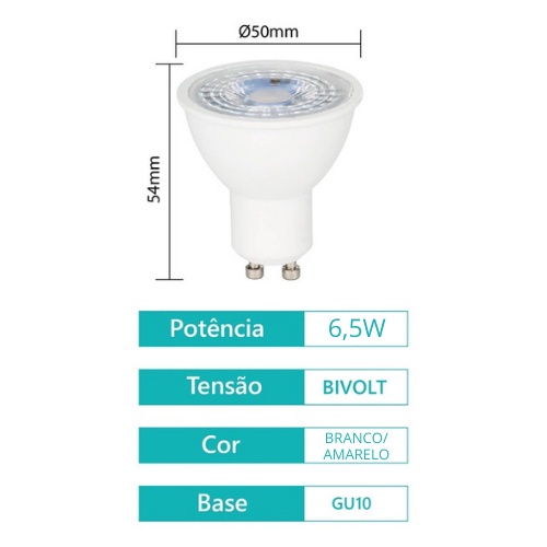 Kit 10 Lâmpada Led Dicroica Gu10 Mr16 6,5w Bivolt Luz Branca/Amarela
