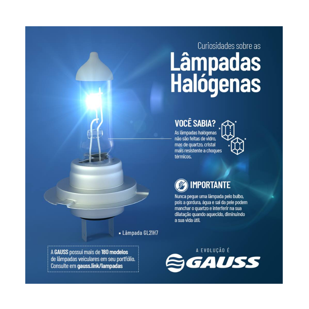 Marca Gauss Modelo Gauss Número de peça GL1034 Cor da luz Branco Tipo de conector P21 Cor da lâmpada: Branca Substitui: Osram: 7528; Philips: 12499 Tecnologia da lâmpada: Halógena Quantidade de lâmpadas: 10 Tensão secundária: 12 V Aplicação: Luz de Freio e Meia Luz Tensão: 12V Linha: Normal Embalagem: Caixa com 10 unid.
